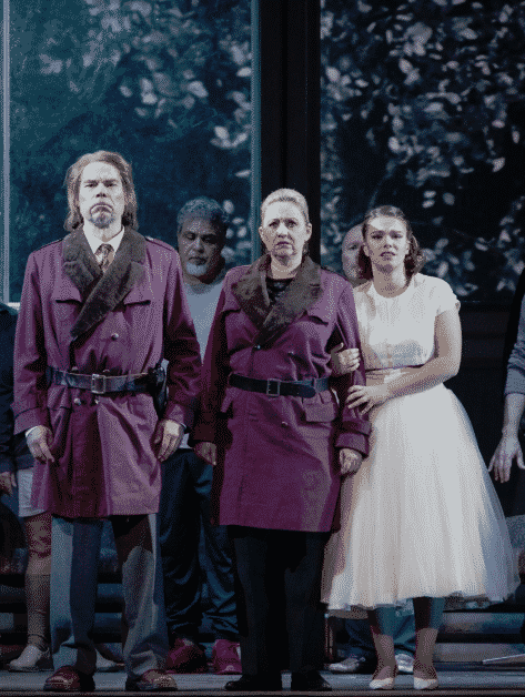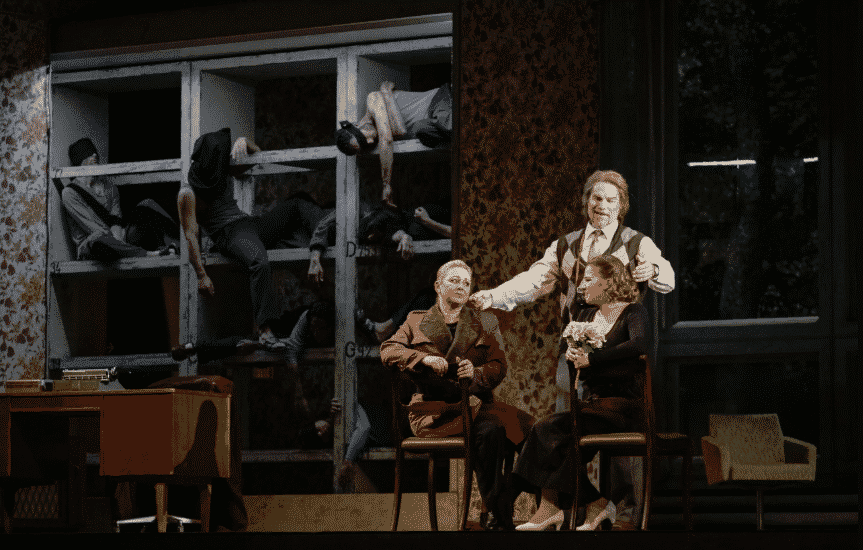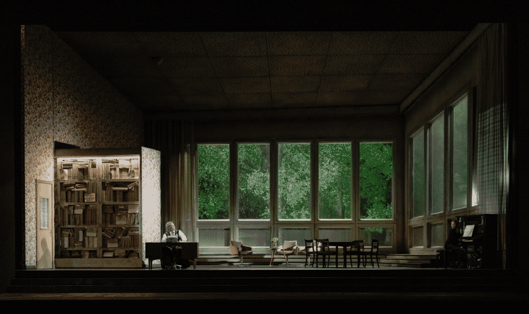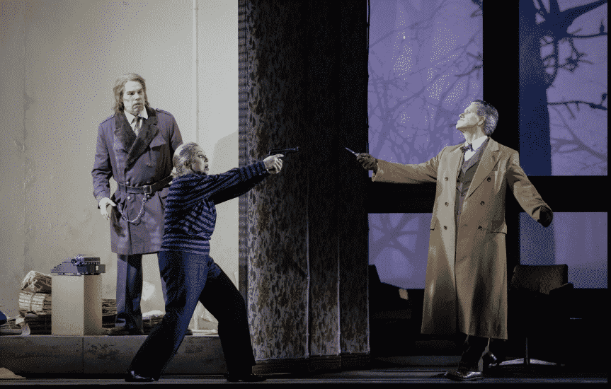 Comment comprendre l’omniprésence d’une nature sauvage sur laquelle donnent les fenêtres de l’appartement ? Celle-ci s’impose particulièrement dès l’ouverture du second acte, alors que retentissent les teintes sombres de l’orchestre. La forêt s’agite, un loup paraît. Est-ce une façon de plonger le spectateur dans le Sturm und Drang d’une époque désormais sensible à la nature, alors même qu’il découvre Florestan reclus, passant de la souffrance à l’enthousiasme ? Le ténor Erin Caves, qui fut Parsifal et sera bientôt Siegfried, nous fait définitivement quitter les rivages mozartiens du premier acte pour des territoires pré-wagnériens.