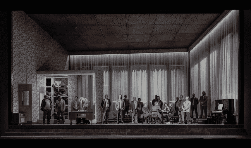 Le parti-pris du metteur en scène suisse Georges Delnon plonge le spectateur dans un univers médiocre, aux antipodes de l’idéalisme porté par Leonore. Le contrepoint entre cet univers trivial et le noble héroïsme de Leonore – et de Florestan, victime de la tyrannie de Don Pizarro – pouvait servir la musique de Beethoven. Ce n’est malheureusement pas ce qu’éprouve le spectateur transporté dans le quotidien étouffant et gris d’Allemands de l’Est des années 70. Cet appartement – la loge de Rocco – à la tapisserie fanée, aux rideaux sans doute autrefois blancs, aux baies vitrées maculées de coulures bien visibles dans la lumière jaune du soleil couchant (acte II), respire une médiocrité qui ne permet l’expression d’aucune poésie.
