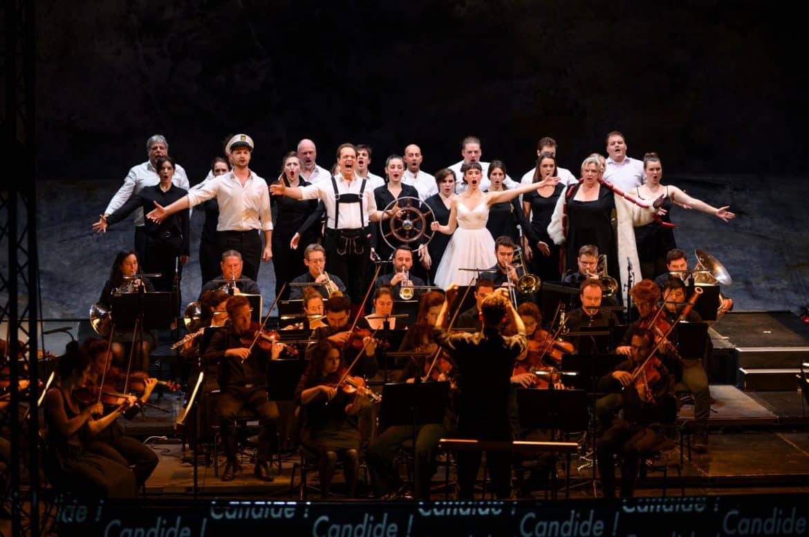 Dirigé sans partition par le talentueux chef/compositeur Patrick Leterme, qui assume aussi la direction artistique de la compagnie, le Candide Symphonic Orchestra & Choir apparaît sur la scène en ensemble réduit et dans une version sémi-scénique de l’opérette de Bernstein. Une formule avec narrateur, qui garde intact le fil rouge avec celle du célèbre concert tenu par le compositeur américain à Londres en 1989. Bien que la « forme de concert » puisse paraître moins spectaculaire aux yeux du passionné d’opéra, dans le cas de Candide elle nous semble encore aujourd’hui la solution la plus convaincante pour illustrer sans effort de mise en scène les multiples péripéties de l’œuvre, que Bernstein et Lillian Hellman s’amusent à définir comme « picaresques ». Et pourtant, le spectacle est émaillé de trouvailles scéniques et de gags à la couleur typiquement belge, parfois un peu triviales, souvent réussies, grâce aux performances d’acteurs des personnages principaux : du naïf Candide à l’espiègle Cunegonde, au « buffo » Pangloss, qui assume la double fonction de personnage et narrateur. Nous attendions peut-être un peu plus de complicité entre les personnages et l’orchestre ou plus particulièrement entre le chef et les chanteurs ou le public. On aurait pu mettre en place par exemple un certain nombre d’interactions pour mieux exploiter la présence du chef d’orchestre sur scène. Si Bernstein en 1989 animait la salle londonienne avec un sens exquis du cabotinage, cela contribua à rendre ce concert inoubliable. Voilà probablement un élément de mise en scène à creuser pour une production qui semble avoir encore un bel avenir devant elle.