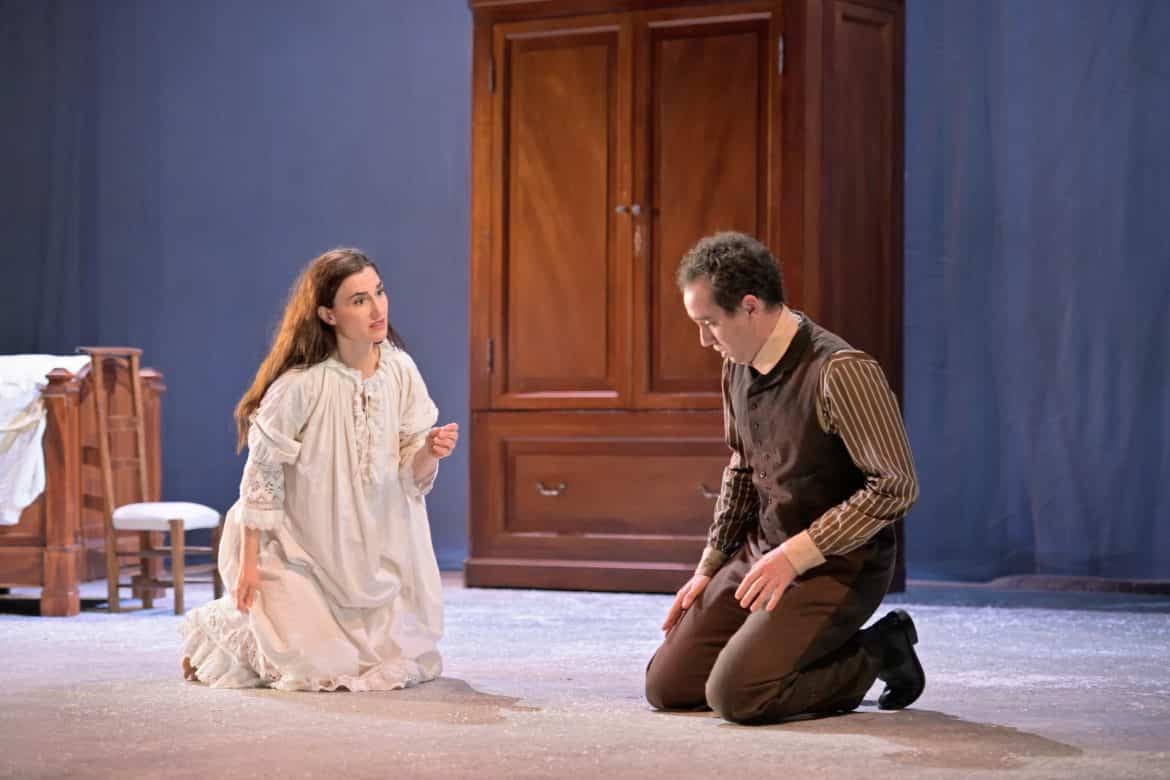 Côté distribution, on n’est sans doute pas très loin de l’idéal… Les petits rôles (desquels se détachent Pierre Derhet, Geoffroy Buffière et Luc Bertin-Hugault pour leur grande intelligibilité, ainsi qu’Aliénor Feix pour sa capacité à donner chair à un personnage qui pourrait n’être qu’une silhouette) sont excellemment distribués. Franck Leguérinel est un Maître André drôle à souhait, excellent comédien n’oubliant pas pour autant, fort heureusement, la dimension musicale du personnage. Philippe-Nicolas Martin donne une belle épaisseur scénique et vocale à Landry, dont il fait le double prosaïque du poétique Fortunio. Comme à son habitude, il est parfaitement compréhensible et soigne constamment sa ligne de chant – ce qui n’est pas un luxe : le rôle de Landry n’a-t-il pas été créé par Jean Périer, le premier Pelléas ? Jean-Sébastien Bou, très à l’aise scéniquement, ne fait qu’une bouchée du rôle de Clavaroche, dont il souligne parfaitement le côté à la fois arrogant, machiste, et…ridicule. Entre le soprano léger de Liliane Berton (Pathé, Pierre Dervaux, 1961) et le mezzo délicat de Colette Alliot-Lugaz (Erato, John Eliot Gardiner, 1984), Anne-Catherine Gillet propose une voie médiane. Le timbre est toujours d’une fraîcheur et d’une juvénilité étonnantes. Mais on sait, depuis une certaine Marguerite liégeoise, qu’il peut aussi se faire lyrique et revêtir de belles couleurs dramatiques : la chanteuse use ainsi avec intelligence de toutes les ressources offertes par un instrument très ductile, et offre donc un portrait particulièrement complet du personnage, d’autant que ses dons d’actrice sont également remarquables : son éveil à l’amour sincère est admirablement rendu, notamment grâce à la très grande expressivité de son visage. Cyrille Dubois, enfin, semble être fait pour interpréter le rôle-titre. Loin de réduire le rôle à un simple adolescent certes fougueux mais très naïf, il donne au personnage des accents werthériens, qu’au demeurant l’œuvre (livret et musique) contient : le quasi évanouissement de Fortunio lorsqu’il comprend que Jacqueline l’aime, n’évoque-t-il pas l’éblouissement qui saisit Werther devant Charlotte pendant le « Clair de lune » ? Les refus de moins en moins convaincus de Jacqueline devant l’empressement du jeune clerc (« Non ! non ! Ne me parlez pas ainsi ! » ) ne rappellent-ils pas ceux de Charlotte après le Lied d’Ossian ? (« Ah ! taisez-vous… Je vous implore ! ») L’exclamation de Fortunio à la fin du troisième acte (« Juste Ciel, il est son amant ! ») ne sonne-t-il pas comme un écho au cri de Werther : « Un autre, son époux ! » ? Quoi qu’il en soit, Cyrille Dubois passe avec une aisance et un naturel confondants de la fraîcheur naïve du personnage à la mélancolie (un « J’aimais la vieille maison grise » très poétique), du lyrisme tendre (« Tout en moi l’accueille et l’appelle ! ») au cri d’amour éperdu (« Elle m’aime ! Je puis vivre ou mourir, que m’importe ! ») ou de désespoir (« Il est son amant ! »).