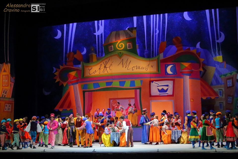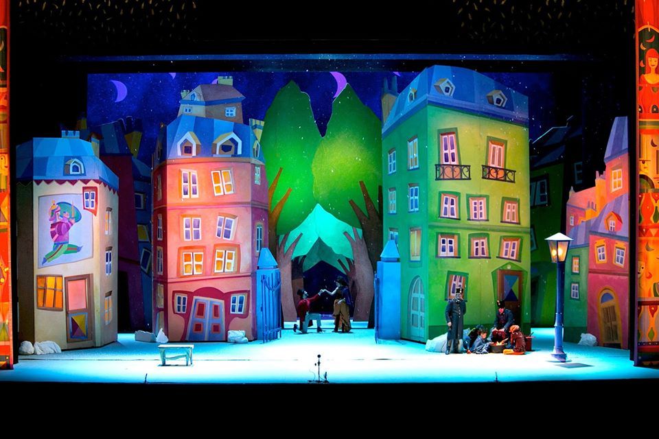 La toile immense qui accueille le public rappelle les décors des Ballets Russes ou les personnages de Chagall sur le plafond du Palais Garnier, et transporte d’emblée dans un décor de fable, de cirque et de jeu. Le reste sera à l’avenant : costumes aux couleurs vives pour l’ensemble des artistes, décors de conte que l’on imaginerait davantage pour Casse-Noisette – c’est la période ! – que pour le drame de Puccini, légèreté du jeu des artistes et de l’orchestre. Et pourtant, pour étonnante qu’elle paraisse au premier abord, la scénographie, appuyée à la mise en scène d’Augusto Fornari, a le mérite d’éviter par définition l’écueil du larmoyant, et de mettre en valeur les liens qui unissent la pièce avec d’autres œuvres de Puccini, notamment Gianni Schicchi (par exemple la scène de la recherche de la clé/ du testament). Ici, les personnages semblent projetés dans une fable cruelle dont ils ne sont pas conscients, continuant jusqu’au bout à jouer leur vie avec insouciance. Les potentialités techniques du Teatro Carlo Felice (double plateau tournant, machinerie gérant quatre scènes articulées) sont mises à contribution pour donner corps à ce monde onirique. Particulièrement beau et impressionnant, le changement de plateau entre le premier et le deuxième acte : un personnage en costume rayé vient introduire une clé géante sur le bord de la cabane qui servait d’appartement aux jeunes artistes, et le décor, se transformant en carroussel géant, et se met à tourner sur lui-même au son d’une ritournelle, dévoilant le Café Momus et les chœurs immobiles, bras tendus vers le public.
