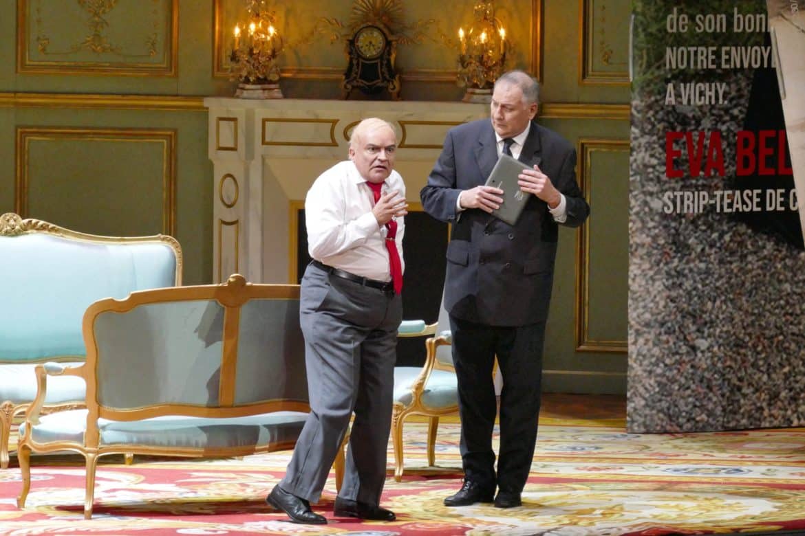 C’est un nom qui s’est imposé dans les mises en scène contemporaines des œuvres d’Offenbach, depuis le devenu-culte Orphée aux Enfers de 1997 : Laurent Pelly signe avec ce titre sa onzième intervention dans le répertoire du bouffon-parisien. Il propose une scénographie plus sage que de coutume, sans forcer le trait des sous-entendus ou s’engager dans une modernité gratuite. L’œuvre est certes réactualisée, mais ce changement de nature ne la dénature pas : la mise en scène se présente ici comme totalement au service de l’œuvre, la transcende sans la transpercer. L’utilisation des corps et des décors répondent à la même pâte artistique que les adaptations précédentes du metteur en scène, si bien que nous pourrions parler d’un « style pellien ». Le premier acte s’ouvre sur un décor de campagne sordide, alors que l’ouverture nous avait plutôt promis, dans ses sonorités, les douces campagnes bucoliques d’Aristée. Le décalage, propre à Pelly, est efficace ; le même est présent pour l’acte III, qui s’ouvre sur une morgue, où Barbe-Bleue entrepose les corps de ses ex. Nous avons toujours chez Pelly ce surgissement d’inattendu qui prend de court le spectateur et lui procure ce rictus nerveux – l’apparition (très lente, et c’est cela qui est efficace) d’une Porsche de luxe au beau milieu du dépotoir des campagnards garantit par exemple cet effet. Enfin, les mouvements chorégraphiés et déhanchés de la masse chorale et soliste (notamment pour les fins d’acte) est un autre ingrédient pellien qui marche à coup sûr. Attention cependant à quelques expédients dramatiques qui peuvent apparaître comme une solution de facilité : la fin du premier tableau de l’acte II se termine par la classique scène de confusion (Stendhal aurait dit pour Rossini, de « folie organisée ») où tous les personnages sortent en courant de la scène, sauf un, qui s’évanouit sur le fermé de rideau. Nous pouvons le considérer, aujourd’hui, comme un cliché. Malgré ses décors très différents (le premier tableau de l’acte II et le dernier acte s’ouvrent sur le décor postmoderne d’un palais du XIXe siècle habité par des businessmen tout en i-phones), Pelly assure une cohérence dramatique avec l’utilisation pertinente d’un grand journal : d’abord projeté sur le rideau à l’ouverture, il sert de toile de fond à l’acte I, il se cache derrière un mur vitré en arrière scène au début de l’acte II et se dévoile seulement par quelques bribes inscrites sur un mur à la fin du même acte. Pelly a voulu faire passer l’histoire de Barbe-Bleue pour un fait divers sérieux, qui s’efface au profit d’une presse à scandale couvrant l’actualité people du moment : le mariage royal – la satire du système est ainsi finement transposée d’Offenbach à aujourd’hui.