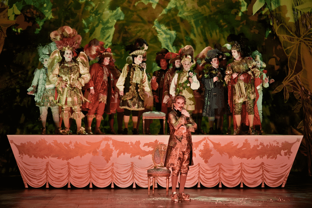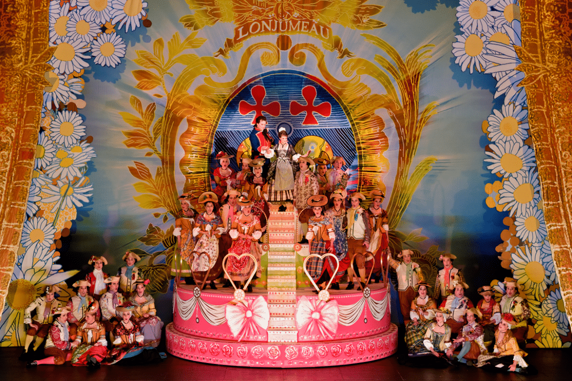 Pour cette redécouverte, la mise en scène joyeuse de Michel Fau excelle à capter l’humour des situations et des temporalités décalées, le tout avec une fluidité remarquable évoluant du parlé vers le chanté, et ce, sans coupures ! L’univers visuel stylise par des couleurs acidulées les costumes Louis XV (Christian Lacroix ) sortis d’une toile de Boucher et réactive l’utilisation de décors en panneaux ou de toiles de fond, tout dispositif en vigueur en ce temps (les fermes, praticables et fonds de scène). Pour exemples, la pièce montée géante sur laquelle sont juchés les jeunes mariés (1er acte), la scène amovible de la pastorale lyrique « ramiste » (2e acte) concilient le réel de l’intrigue avec le clin d’œil actuel de distanciation. Faut-il regretter qu’ils laissent peu de place aux mouvements d’acteurs, de fait souvent en position frontale ? Ou bien s’agit-il, là également, d’un choix esthétique « historisant » ? Quoiqu’il en soit, les coiffes (le casque doré à panache de Saint-Phar) et les perruques démesurément élevées de Madame Latour et de sa suivante Rose (Michel Fau) contribuent à la charge de cette mise en abime du siècle des Lumières par le XIXe siècle. Une manière humoristique de revisiter l’outrance des caricaturistes du siècle d’Adam – Cham ou Daumier – que le travesti de Michel Fau en soubrette ne trahit pas … (on se souvient de son extravagant Récital emphatique).