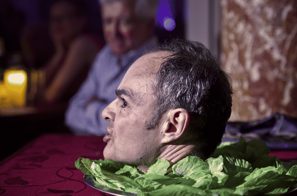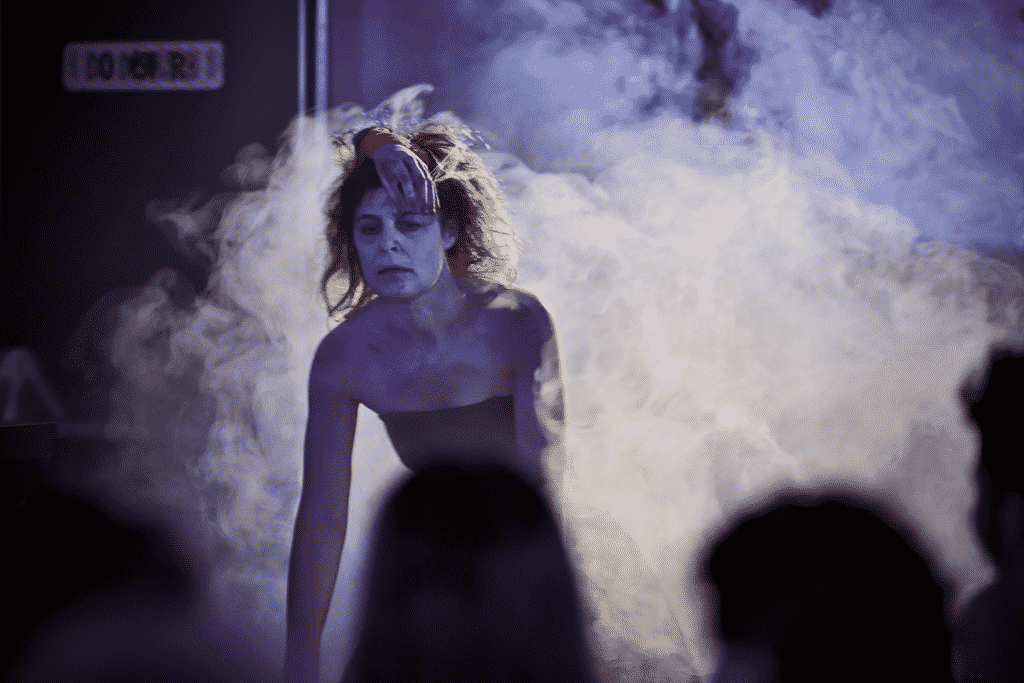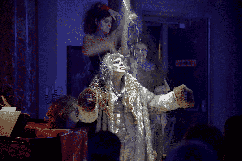 Valérie Lesort référence de manière assez habile son spectacle qui tient à la fois de la fête macabre et qui par son aspect un peu sanguinolent (pensons aux paroles du « Tango des bouchers » de Boris Vian chanté par Lionel Peintre avec beaucoup de gouaille, aux mains tachés de sang des chanteurs), rappelle l’esprit du théâtre Grand-Guignol. Mais c’est aussi au cinéma qu’elle fait appel. L’orgue n’est pas sans évoquer de vieux films de vampire tout comme il peut rappeler aussi que l’instrument était très prisé dans les salles de spectacle à la fois en tant qu’instrument accompagnateur du film et qu’il servait, enfin, à intercaler des interludes. C’est le cas ici, où avant l’air de la Folie de Platée, la pianiste prélude une pièce dans un style qui peut rappeler Bach. On sera également sensible aux effets de lumière bien choisis et à propos. C’est le cas par exemple avec l’Air du Feu, dans l’Enfant et les sortilèges de Ravel, où se succèdent des effets jaune-orangé tandis que l’on entend, grâce aux poils d’un balai placé très près du micro, le crépitement du feu. Si le spectacle est sur la scène, il est aussi dans la salle qui sert aux chanteurs : entrée fracassante, sous les projecteurs, de Judith Fa dans « Furie terribili » du Rinaldo de Haendel ou encore un Lionel Peintre qui, habillé d’un costume de squelette, se déhanche sur les rangées de la baignoire au son de La Danse macabre de Saint-Saëns.