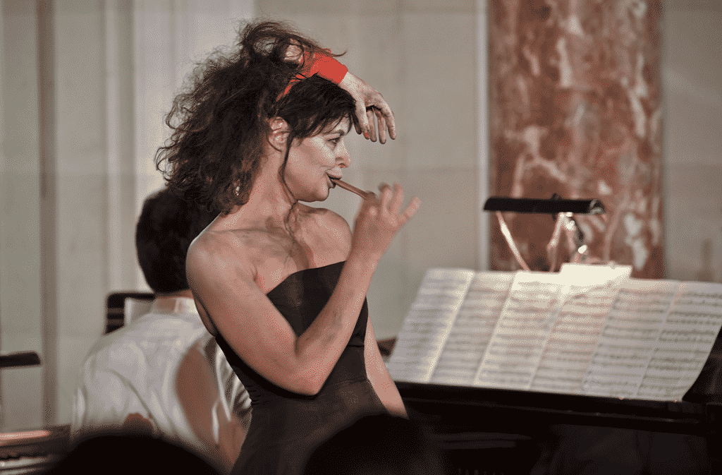 Le spectacle que met en scène Valérie Lesort relève du tour de chant typique de l’esprit du cabaret, où l’on joue aussi la comédie, mais dans lequel on trouve de nombreux clins d’œil qui créent une connivence avec le spectateur. Dès le lever de rideau, nous sommes plongés dans une ambiance angoissante. Quelle est donc cette mélodie qu’égrène la pianiste (Marine Thoreau La Salle) ?… Oui ! Il s’agit du générique de l’Exorciste de William Friedkin et le spectacle s’achèvera sur quelques pas de danse bien chaloupés avec « Thriller » de Michael Jackson, qui, pour l’occasion, est revenu d’entre les morts… La metteuse en scène fait aussi la part belle à la parodie. Ainsi, le début de ce Cabaret Horrifique s’ouvre-t-il également sur une réécriture pour le moins osée : prendre « l’Invitation au voyage » de Duparc en lui accolant les paroles de la « Salsa du démon » ! Il s’agit donc bien, pour Valérie Lesort, de nous convier à un voyage musical comme en témoigne la variété des nombreux extraits musicaux. On saute à la fois les époques et les genres et c’est pour ainsi dire toute la musique qui est représentée : opéra, lieder, chanson, comédie musicale. Les chanteurs Judith Fa et Lionel Peintre, grimés comme dans la famille Adams, nous offrent quelques beaux moments musicaux même si l’on peut trouver parfois des faiblesses vocales : des aigus qui craquent, une intonation qui, quelque fois, fléchit (notamment dans « Erlkönig » de Schubert). On peut néanmoins saluer la performance des deux chanteurs qui trouvent de très beaux accents dans les différents répertoires proposés : beau « Nosferatu » de Marie Paule Belle ou encore un « Grand Lustucru » très lyrique et poétique, chargé d’émotion (interprétés par Judith Fa), ainsi que beaucoup de pathétique dans l’air du Froid du King Arthur de Purcell où Lionel Peintre est éclairé par une lampe-torche tandis que tombent sur lui des flocons de neige. Dans ce spectacle, on ne tire pas sur la pianiste, mais on essaie de s’en débarrasser au moins à trois reprises : on l’étrangle et on l’égorge, on lui casse une bouteille sur la tête ou pire encore, on lui arrache le cœur.