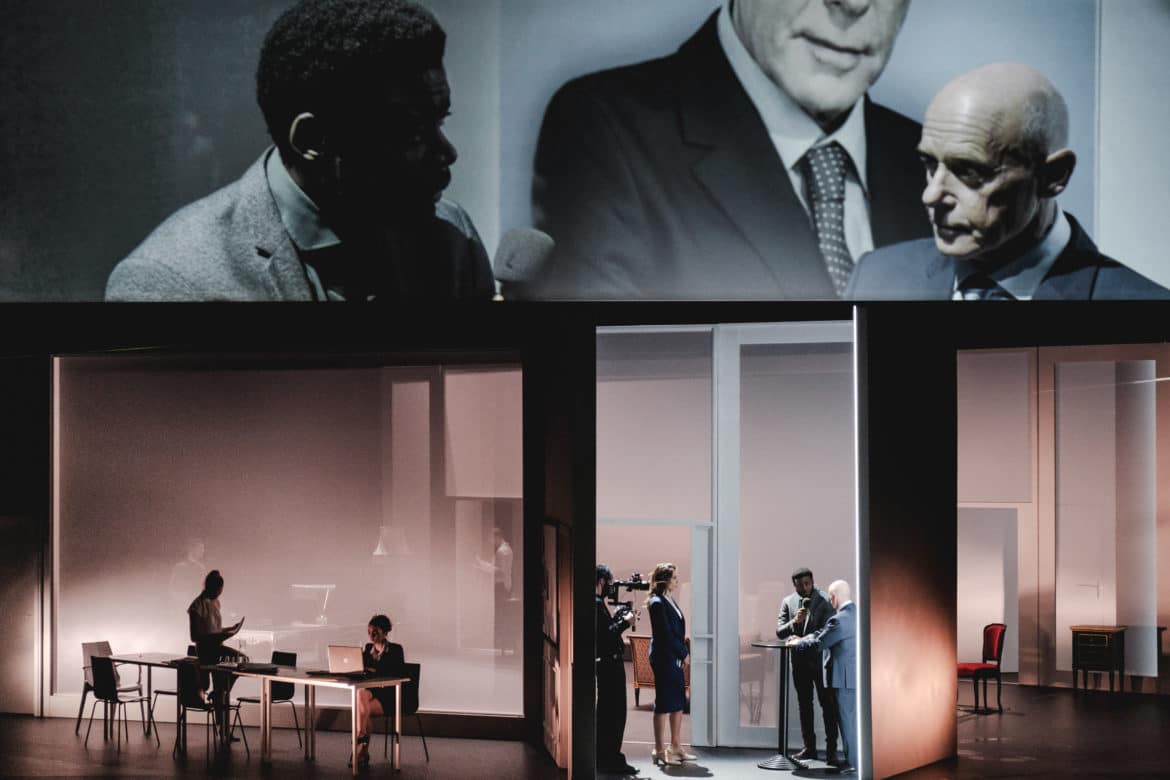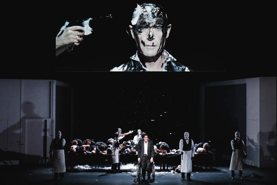 Les photos du spectacle laissaient penser que l’on assisterait à un spectacle presque convenu dans sa convocation de procédés vus, revus et re-revus : maquillage façon Joker de Batman et fauteuil roulant (deux des éléments les plus en vogue actuellement sur les scènes lyriques) et bien sûr l’inévitable « performance filmique » (tournage et retransmission en direct du spectacle sur la scène même où il est joué), procédé que l’opéra semble découvrir au moment même où le théâtre commence à s’en lasser… Pourtant, même si la mise en scène ne nous a qu’en partie convaincu, c’est un spectacle vraiment intéressant qu’a proposé Marie-Ève Signeyrole sur la scène de l’Opéra du Rhin, réfléchi, avec sa logique propre, à mille lieues de certains « concepts » (?) sans ligne directrice ni cohérence qui tiennent trop souvent lieu de lecture de l’œuvre.