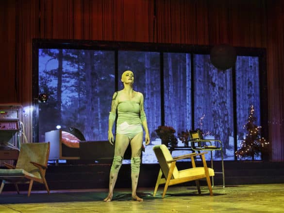 Dans cette mise en scène, Emilia Marty se meurt et est aux abois dès sa première apparition sur scène. Et elle aura de plus en plus de mal à donner le change aux personnes qui la côtoient : sa perruque mal ajustée, ses évanouissements incessants, les plaies qui couvrent sa peau, les gélules qu’elle avale nerveusement trahissent le fait que l’élixir qui la maintient en vie depuis 300 ans perd de son efficacité – et que la fin est proche : durant 2 heures, c’est à la descente aux enfers d’une star du chant que l’on assiste. Au sens propre : Emilia Marty finit par s’enfoncer dans le sol tandis que tout ce qui l’entoure (êtres humains, mobilier) disparaît progressivement dans une obscurité grandissante.