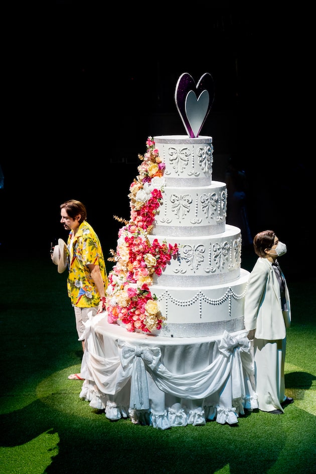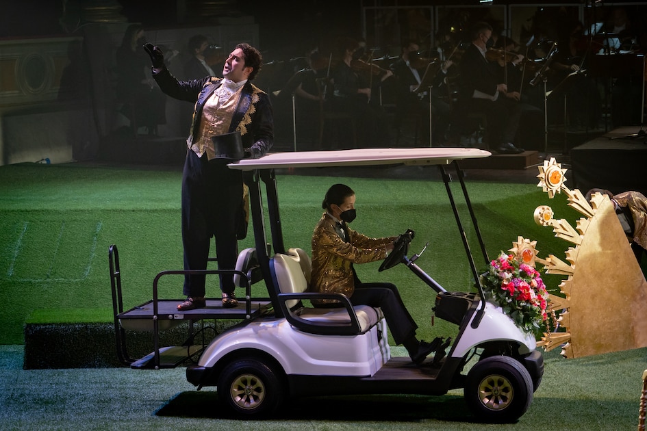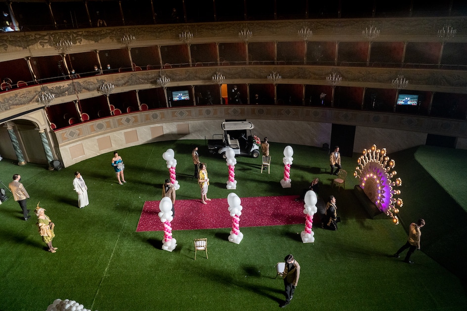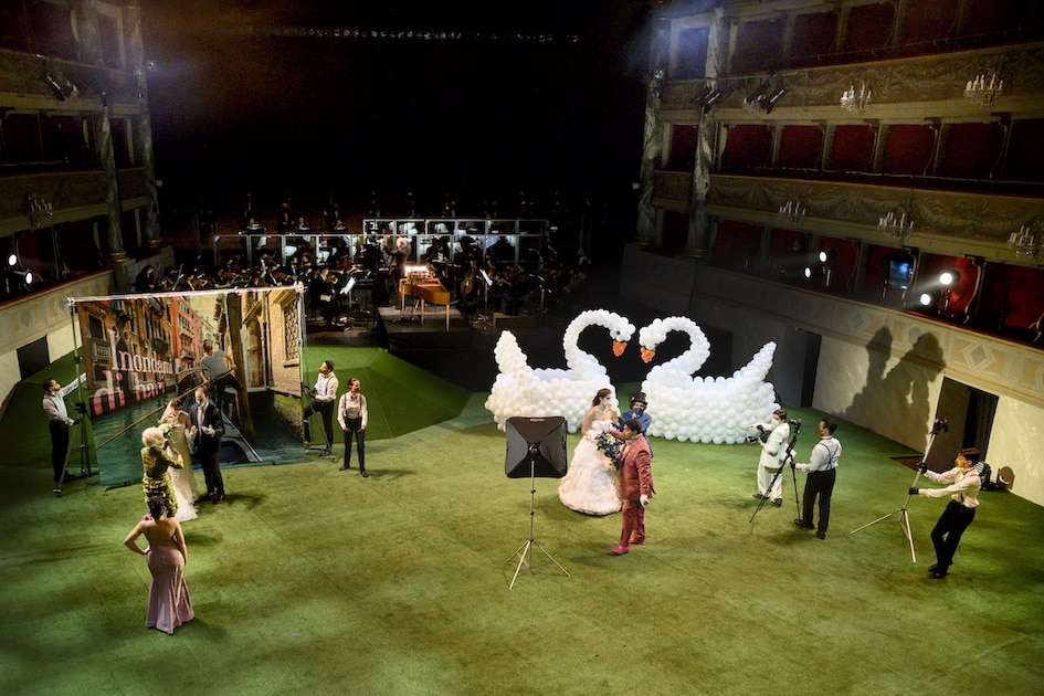 « Oh tu, Cupidine | d’amore artefice […] Auricrinito Apolline | dal bel Castaglio margine […] alla Parrasia cima…». Gaia Petrone est Sabina (une photographe de mariages), à qui le compositeur offre les pages les plus virtuoses comme la cavatine « Sospiri del mio sen » au premier acte et l’aria avec chœur du second « Non mostrarmi in tale istante ». Un timbre agréable, une belle agilité et une grande rigueur stylistique sont les caractéristiques de la jeune mezzo-soprano. Agilité et puntature caractérisent quant à eux le Claudio de Giorgio Misseri, qui émet brillamment ses aigus dans ses différentes interventions – entre autres, celle des « Affetti teneri » accompagnés par la clarinette. L’expérience de Manuela Custer est appréciable dans le rôle ironique de la Nonna. Claudia Urru (Rosaura) et Daniele Lettieri (Anselmo) interviennent dans de nombreux numéros d’ensemble, dont le quintette reconstitué « Aura gentil che mormori » et le finale quelque peu expéditif au cours duquel, comme dans un opéra baroque, tout le monde monte sur scène pour chanter la morale « de l’amour au doux enchantement » (« d’amore al dolce incanto / mai contrasto non vi fu / quando unite assiem si vede / grazia, fede, e gioventù »), aussi mielleuse que l’arrière-plan des photos des mariés… et aussi fausse que l’herbe dont le metteur en scène Davide Marranchelli (dans un spectacle amusant auquel ont également pris part Anna Bonomelli pour les décors et Linda Riccardi pour les costumes), a recouvert le parterre du théâtre Donizetti. Le public a été remplacé par un gazon synthétique sur lequel les jeunes garçons jouent au football avant d’être rappelés par le chef Montanari qui récupère le ballon et entame l’ouverture de l’opéra, tandis que sur le parterre prennent place des cygnes constitués de ballons de baudruche, des photographes et des mariées de plus en plus nerveuses : le cadre retenu pour cette histoire divertissante est en effet l’un de ces lieux qu’on loue pour les mariages. Afin de respecter les mesures sanitaires, chacun se tient à une distance de sécurité, porte des gants et utilise un masque lorsqu’il ne chante pas, mais ces handicaps sont transcendés par l’habileté des acteurs-chanteurs, très bien dirigés par le metteur en scène qui actualise avec beaucoup d’ironie les éléments constitutifs de la farce.