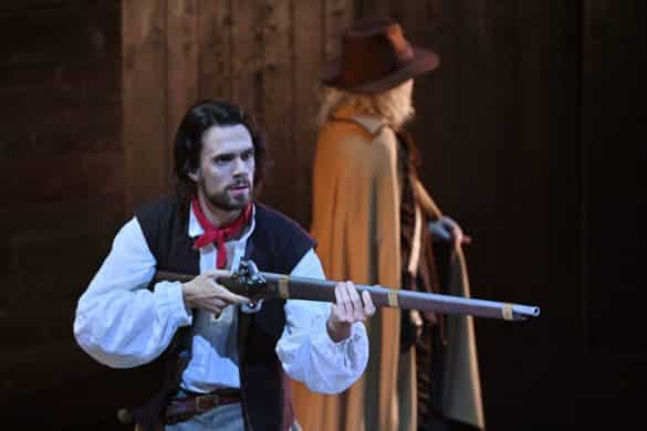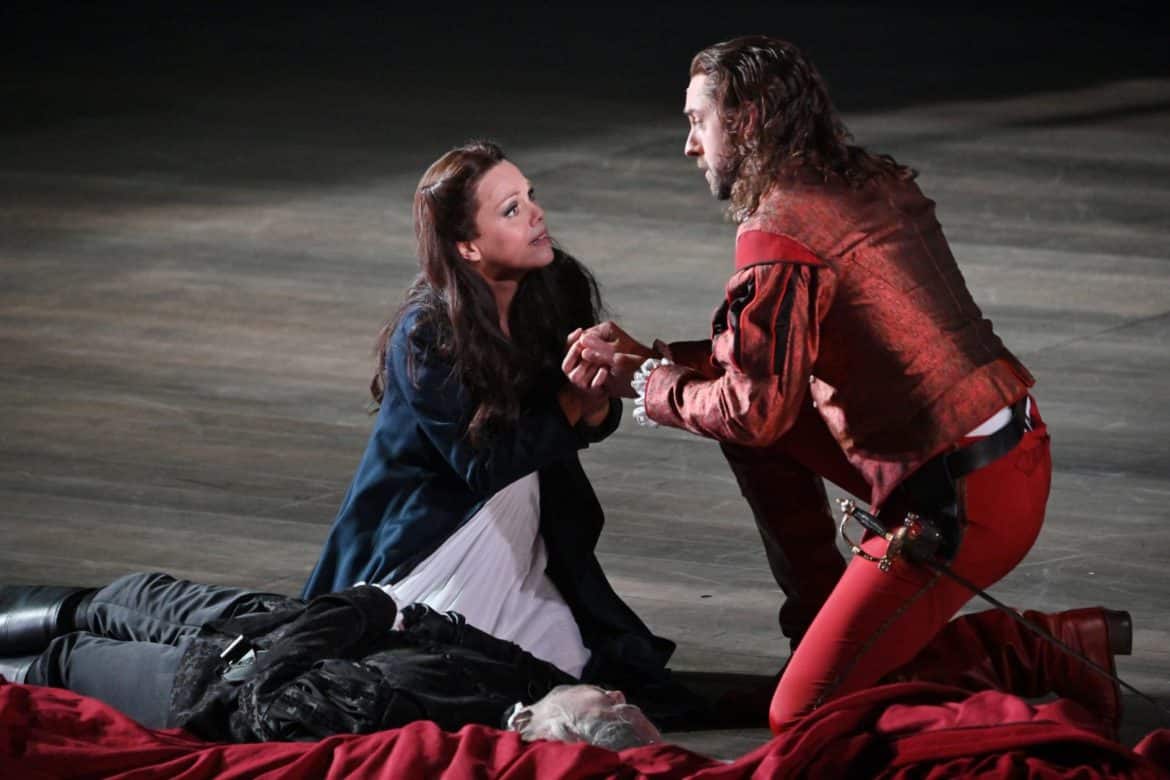 La narration de Loy est claire et fidèle au texte, les vêtements sont d’époque, il y a des épées, le catalogue de Leporello, le panache blanc de Don Giovanni. Les costumes de Mousquetaires d’Ursula Renzenbrink situent l’histoire à l’époque du Burlador de Tirso de Molina, dont l’opéra de Mozart est dérivé, tandis que le décor unique de Johannes Leiacker propose une grande salle vide qui semble avoir jadis connu une certaine splendeur : deux fenêtres à gauche, une grande cheminée à droite et, à l’arrière, un mur avec une ouverture vers l’extérieur. L’idée qui sous-tend le spectacle est le vide sentimental des personnages et de leurs interactions, qu’il s’agisse de libertinages vains ou de mariages futiles. Un rideau rouge tendu à l’avant-scène évoque un filet de sang, sur lequel le Commandeur s’affaissera. Il réapparaîtra dans la scène finale pour l’entrée du Commandeur, l’opéra se terminant par la mort de Don Giovanni comme dans la version viennoise. En raison de la nécessité de terminer la représentation avant 23 heures, comme le prescrivent les autorités, non seulement le concertato final est coupé (dans la lecture de Loy, le finale moralisateur n’aurait pas eu de sens ici), mais également les airs de Don Ottavio (« Dalla mia pace la sua dipende« ), de Donna Elvira (« Mi tradì quell’alma ingrata« ) et le duo Zerlina/Leporello – comme dans la version de Prague.