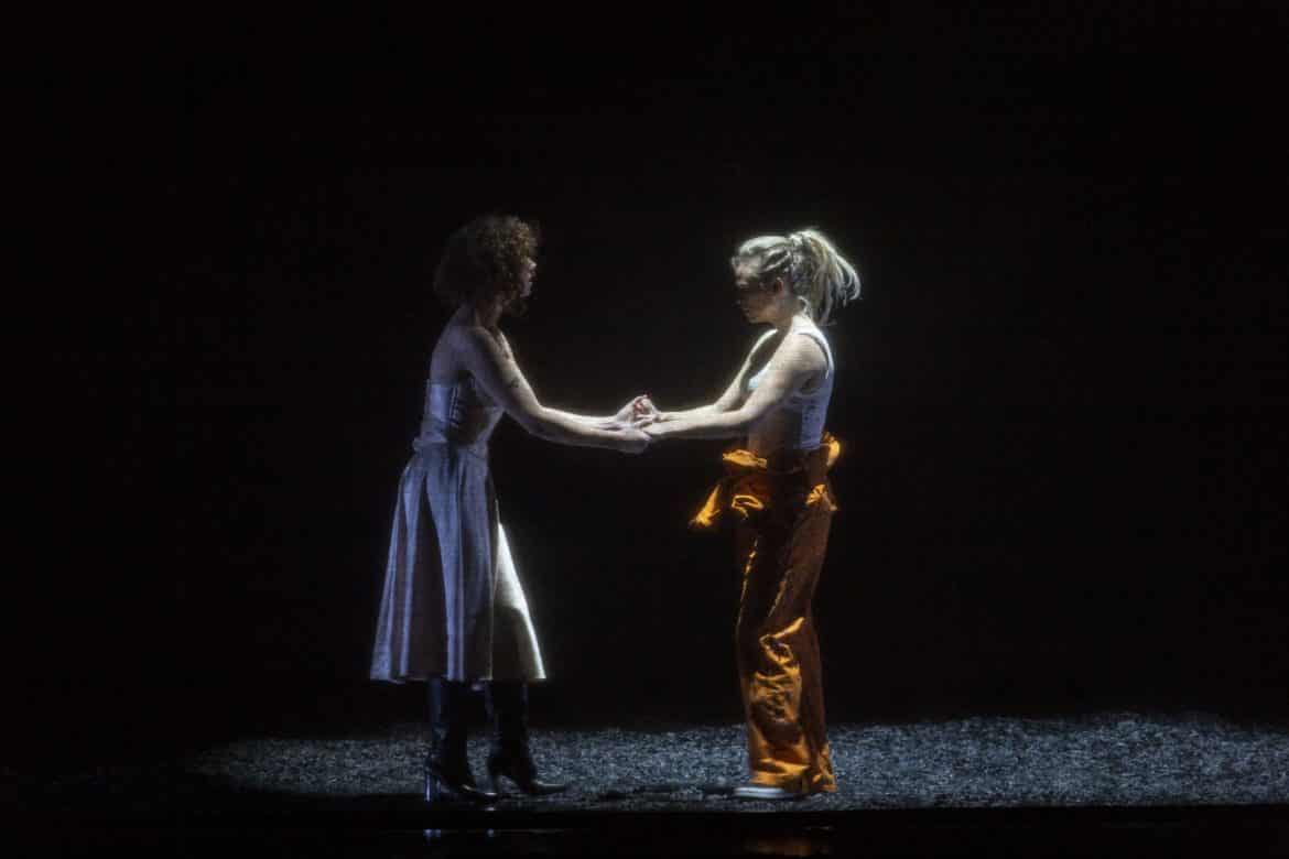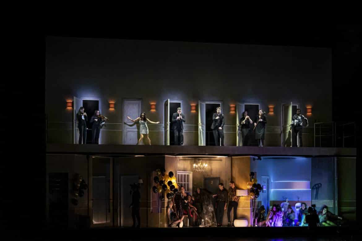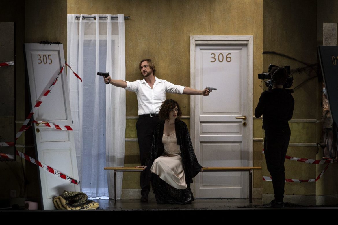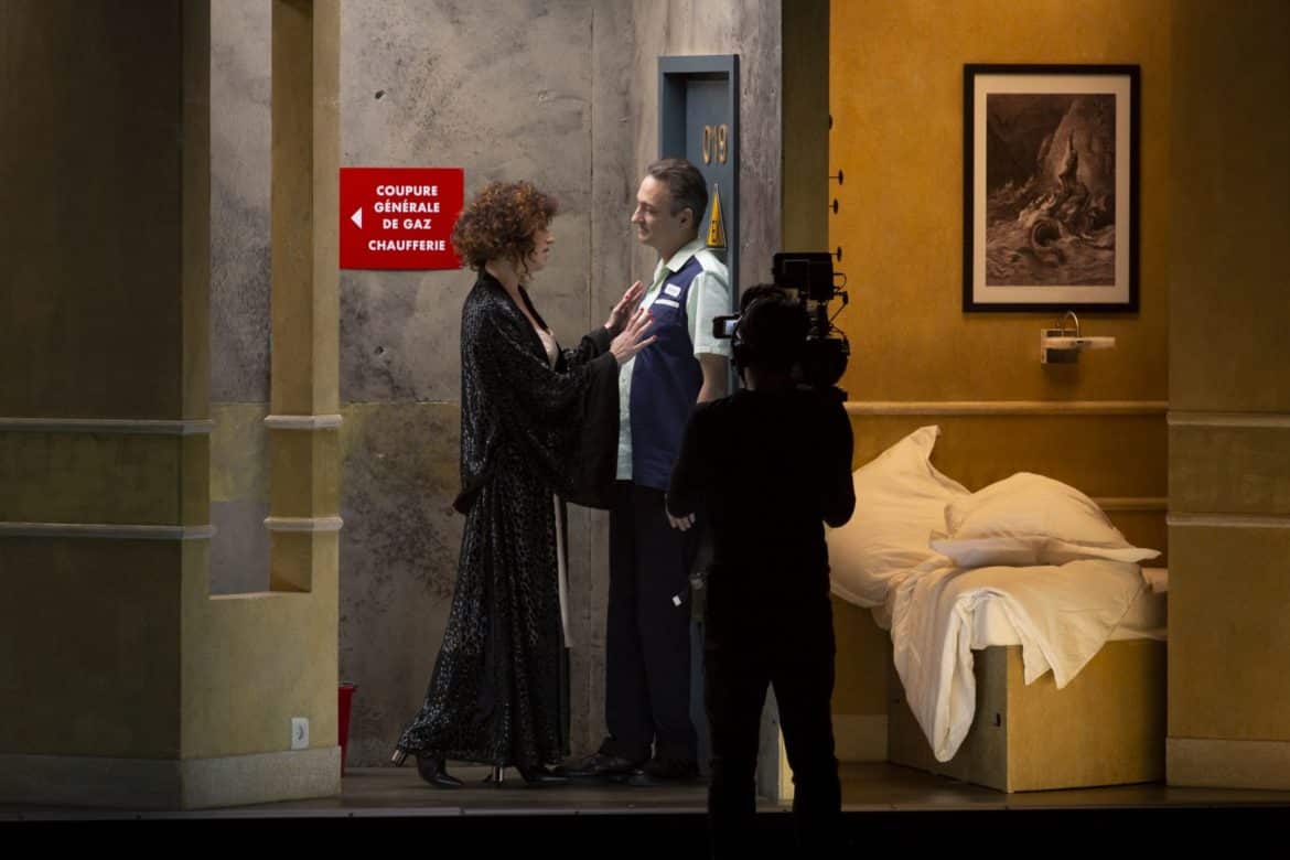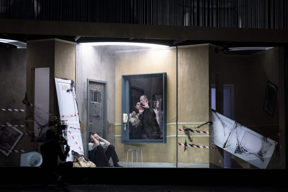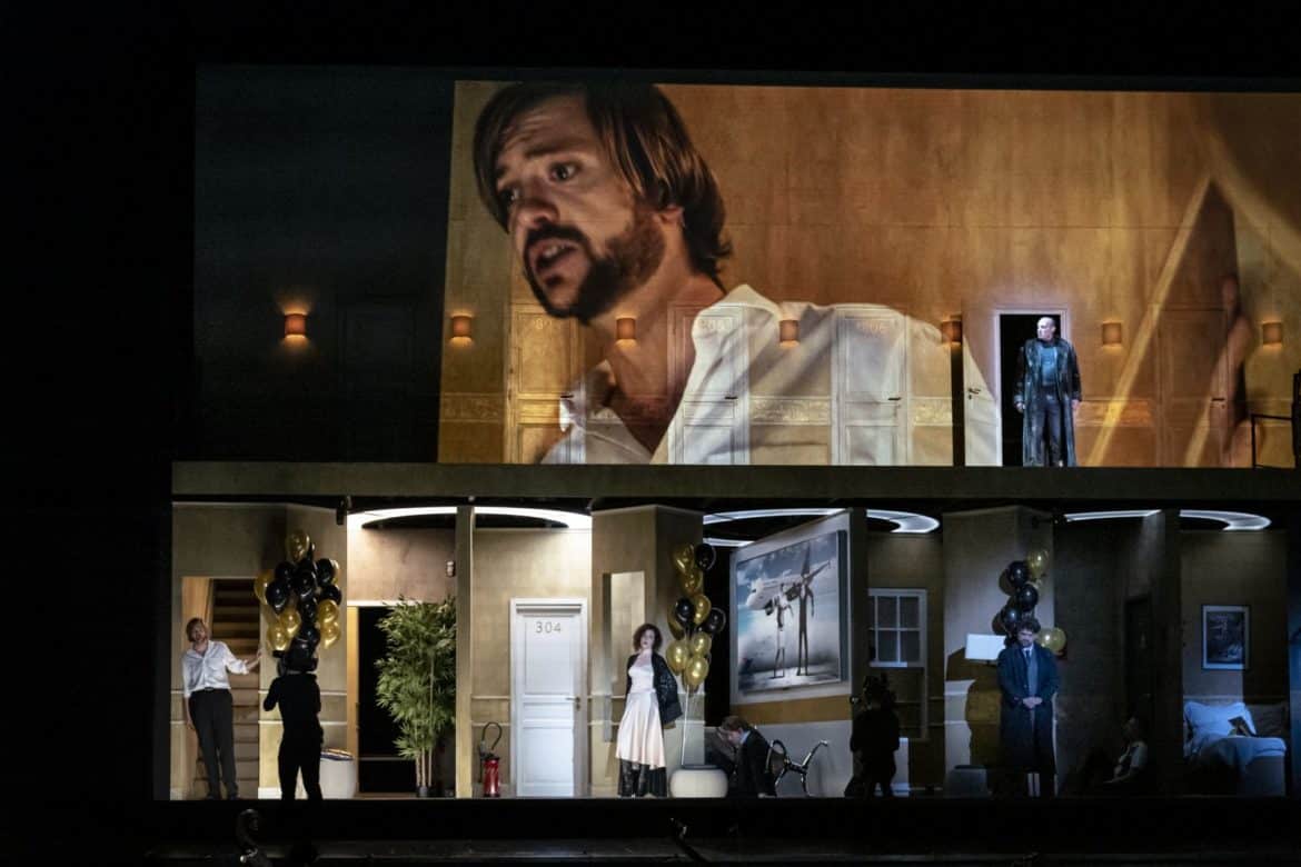 La scénographie créée par Vincent Lemaire pour le long premier acte est complexe. La scène est divisée en deux niveaux : à l’étage inférieur, des sections qui tournent pour créer continuellement de nouveaux environnements – les chambres d’un hôtel, les cellules d’une prison, l’intérieur d’un ascenseur, un salon d’aéroport… – avec un effet très cinématographique ; à l’étage supérieur, une série de portes numérotées, comme celles d’un hôtel/bordel, mais plus souvent un écran sur lequel sont projetées les images filmées par des caméras mobiles : ce n’est certes pas une nouveauté dans le monde de l’opéra moderne, mais cela reste efficace. L’aspect labyrinthique du palais d’Atlas est très bien rendu par le changement continu des décors, tourbillonnant notamment dans le final du premier acte avec tous les personnages qui se cherchent pendant que le chœur entonne solennellement et tristement : « Oh, comme il est difficile de ne pas trouver qui on aime ! ». Le deuxième acte est minimal, avec un vide noir qui engloutit les personnages, tandis que le troisième acte est lumineux, avec un rideau de fils qui descend d’en haut. À ce stade, la scénographie est un peu décevante par rapport à ce que nous avons vu auparavant : la disparition du château pendant le finale, qui était le point fort, spectaculaire, de la première au Palazzo Barberini, ne se reproduit pas ici. Deux danseurs prennent en charge les mouvements de krump moderne – déjà vus dans les mémorables Indes galantes à l’Opéra Bastille, également dirigé par Alarcón – pour accompagner le magnifique « Di cupido entro alla reggia » des Nymphes, puis le finale.