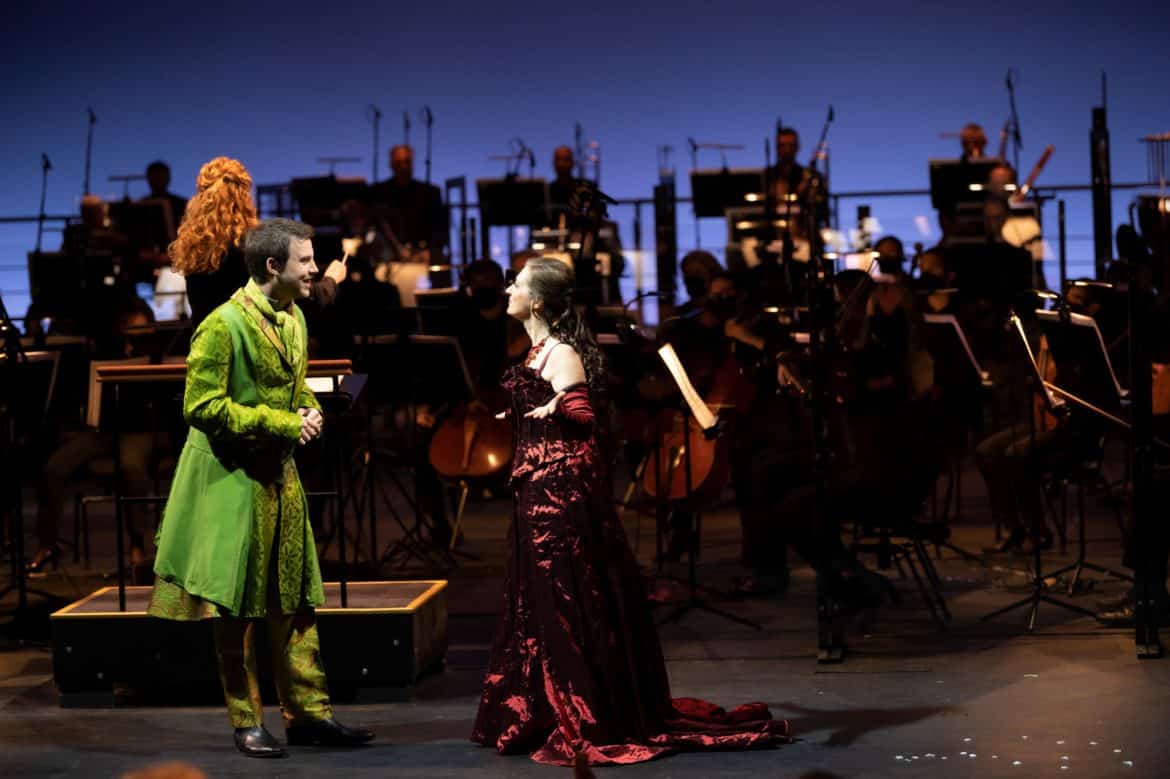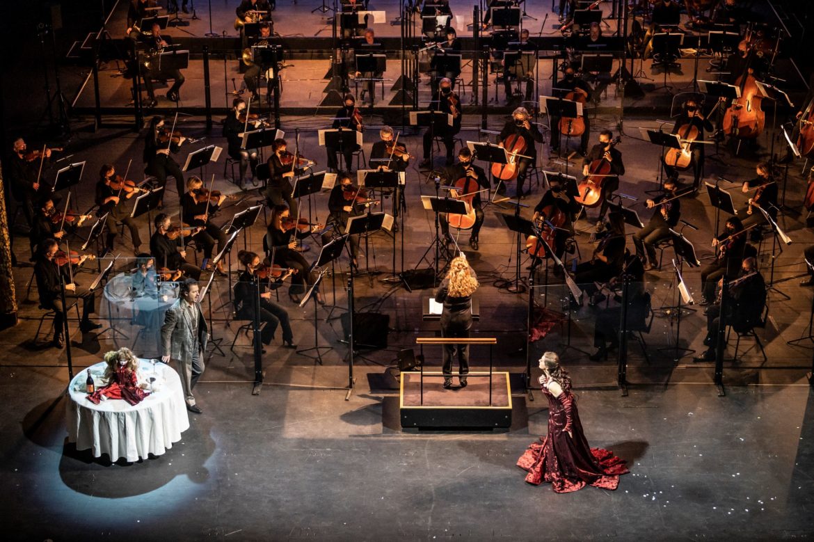 Afin de rendre le spectacle compatible avec les mesures sanitaires, les choristes sont placés côté spectateurs et chantent masqués. Les chanteurs évoluent devant l’orchestre, dans une mise en espace sobre et efficace axée principalement, comme on s’en doute, sur le jeu des acteurs, au demeurant tous bons comédiens. L’orchestre s’est montré en très bonne forme, avec notamment des cordes peut-être plus homogènes et chaleureuses que d’habitude. Les musiciens rendent au mieux les volontés de Speranza Scappucci, qui propose de l’œuvre de Verdi une lecture puissamment dramatique, rythmée par de forts contrastes et de puissants climax. La cheffe aborde la partition avec la volonté très nette d’y imprimer sa marque, opérant pour cela certains choix parfois un peu déroutants : mise en relief de tel ou tel détail de l’orchestration, points d’orgue étonnamment étirés sur certains accords (tel celui, très longuement tenu, concluant le « Digli che vivere ancor vogl’io » du dernier acte), effets rythmiques surprenants (l’accelerando dans la reprise du « Sempre libera », le tempo du second tableau du deuxième acte, mené à un train d’enfer). On aime ou on n’aime pas, mais force est de constater qu’il s’agit là d’une lecture tout à fait personnelle de l’œuvre… et qu’il se passe toujours quelque chose à l’orchestre !