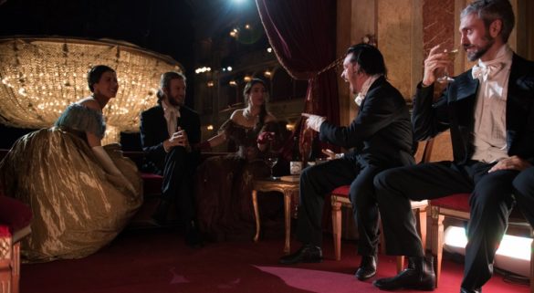 La Traviata a fait l’objet d’innombrables transpositions et adaptations : le fait qu’il s’agisse d’une histoire contemporaine du public de 1853 a eu un impact choquant sur le public d’alors, et il faut imaginer quelque chose de tout aussi scandaleux pour le public d’aujourd’hui si l’on veut conserver le sens de l’opéra. Martone choisit de préserver le cadre du XIXe siècle par les costumes (d’Anna Biagiotti) et le mobilier, tout en utilisant l’Opéra de Rome comme décor. Les spectateurs virtuels sont accueillis par le lustre de la salle des Costanzi, descendu à quelques mètres du sol, se profilant avec ses trois mille kilos de cristaux de Bohème. Le parterre est complètement vide – les fauteuils cassés vont enfin être remplacés ! – et une grande table centrale, encombrée de bouteilles et de verres à champagne, est utilisée pour la fête chez Valéry. Elle sera ensuite utilisée dans le deuxième acte comme table de jeu chez Bervoix et pour les évolutions des gitanes et des toreros. Le théâtre tout entier devient un espace scénique : les loges, les escaliers, le foyer, les couloirs, tout est utilisé, y compris les recoins cachés, refuge de petits moments de plaisir comme cela se produit dans chaque fête légèrement transgressive.