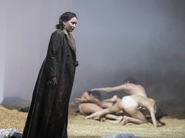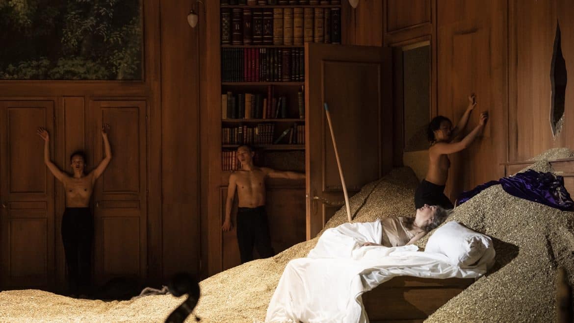 Certes, même s’ils semblent s’inscrire dans la logique d’un récit qui explore la psyché de l’héroïne de Purcell comme le Dr Jekyll & Mr Hyde de R. L. Stevenson, des épisodes de cette intrigue parallèle peuvent choquer. Voir une femme âgée déshabiller un homme pour lui faire une fellation, simplement suggérée, ou voir le même homme paraitre nu, le corps couvert de sang, le cadavre de son fils sur les épaules avant de s’accoupler avec une jeune femme ne laisse pas indemne. L’action se passe dans le décor unique d’une chambre-bibliothèque aux murs couverts de tableaux où trône un lit immense que surplombe la galerie de la Chambre des Communes. Pendant que les chanteurs exécutent l’opéra de Purcell, les Peeping Tom nous offrent son versant noir, avec figures de réfugiés et récits d’esclavage, dans une parabole violente sur les horreurs de notre temps comme inspirée de l’univers macabre, grotesque et cruel de leur compatriote Michel de Ghelderode. Leur Didon, renommée Didi, ressemble à la reine Anne alourdie par ses dix-sept grossesses que campe Olivia Colman dans La Favorite de Yorgos Lanthimos. Ancienne cantatrice, c’est la veuve tyrannique d’un autocrate du style Ceausescu, obsédée par le décès de son époux, la nécessité de le remplacer, son emprise sur son peuple et la satisfaction de ses pulsions sexuelles. Elle finit à moitié étouffée sous le sable qui envahit sa demeure après une tempête et une révolte, dans une atmosphère digne du Titus Andronicus de Shakespeare, sa tragédie la plus sanglante ou des Désastres de la Guerre de Goya.