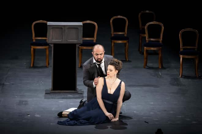 Si les contraintes de l’épidémie se voient dans l’adaptation de la fosse, déplacée au parterre pour laisser aux musiciens l’espace nécessaire aux protocoles, elle se lisent aussi dans le spectacle scénique. La production de Robert Carsen ne pouvant être présentée avec les restrictions actuelles, Caroline Sonrier et l’Opéra de Lille ont confié à Olivier Fredj une nouvelle mise en espace. Avec la complicité des lumières très cinématographiques de Nathalie Perrier, le Français tire parti de la nudité du plateau, à peine meublé de quelques chaises pour symboliser un coin de nef d’église ou les appartements de Scarpia, et de quelques projections vidéo – on retiendra essentiellement le visage de Tosca qui, en noir et blanc, ponctue le drame, en particulier à chaque fin d’acte. La répartition des choeurs au premier balcon fait déborder la scène de son cadre et accentue la théâtralité de leurs interventions, aux allures de commentaire de la foule – presque un dispositif de Passion. Les textes sur le rideau se donnent comme des lignes extraites des mémoires de Scarpia, fussent-elles posthumes ou apocryphes, et livrent le point de vue du baron sadique, en explicitant certaines ellipses tragiques, à l’exemple de l’exécution du comte Palmieri, prétendue simulée alors qu’elle fut à balles réelles, comme plus tard, celle de Cavaradossi. L’horloge numérique reproduite à chaque début de séquence souligne une unité de temps sur le mode de l’urgence. Quant au nœud avec lequel se pend Tosca à la fin, elle renvoie au supplice qui devait être celui de Mario Cavaradossi – avant que Scarpia ne préfère l’ambiguïté de la fusillade. En somme, le minimalisme cinématographique n’interdit pas quelques commentaires dramaturgiques, parfois bienvenus, pour le néophyte d’abord.