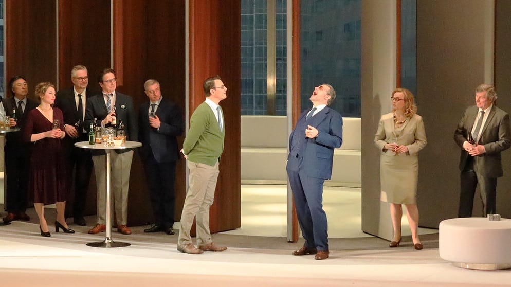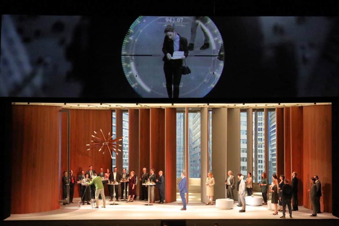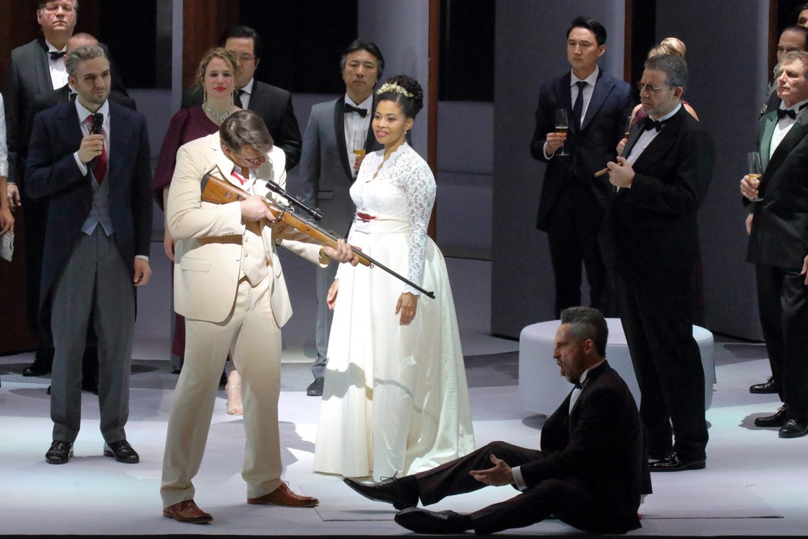 Après Warlikowki, Tcherniakov : en ce lundi 5 juillet 2021 avait lieu la première représentation d’une série de reprises du Freischütz vu par le célèbre metteur en scène russe – un spectacle précédé d’une flatteuse réputation. Lorsque le rideau se lève, on découvre non pas la place du village prévue par le livret, mais les salons de réception d’une grande entreprise, dont Kuno est le patron dénué de toute morale et de tout scrupule. Le jeune Max ne souhaite pas, en gagnant la main d’Agathe, devenir garde-chasse, mais convoite un poste important dans l’entreprise. Pour ce faire, Kuno exige qu’il se transforme en sniper et abatte au hasard un passant. Le jeune homme ne peut s’y résoudre ; c’est Killian qui se charge de la besogne, récoltant les hourras de la foule, laquelle se moque bruyamment du pauvre Max…