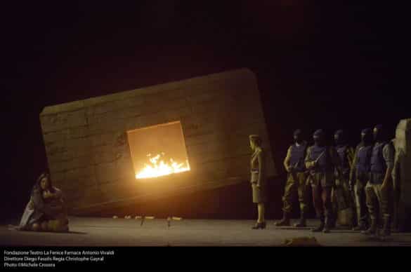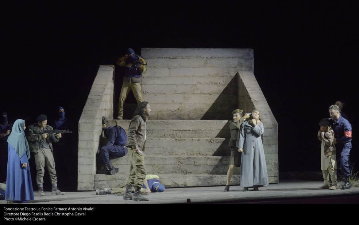 Parlons de ce qui fâche. L’art de la mise en scène fait couler beaucoup d’encre, entre relectures, transpositions, ou, au contraire, restitution en costumes d’époque qui n’évite pas toujours le kitsch. Sans céder au persiflage facile, il faut bien avouer que la production de Christophe Gayral est consternante. Que l’action soit transposée dans un Moyen-Orient contemporain, ou, plutôt, en Asie centrale, est une idée simple susceptible de proposer de beaux tableaux. Mais les sempiternels militaires en treillis et gilets pare-balles, armés de mitraillettes, les commandos cagoulés d’une part, les femmes voilées, puis dévoilées, d’autre part (costumes d’Elena Cicorella), que l’on voit sur les scènes lyriques depuis trop longtemps finissent par lasser lorsque ces partis-pris sont maniés sans subtilité et sans beauté. Les quelques blocs de béton, nécessairement disposés de guingois (décors de Rudy Sabounghi), renvoient, semble-t-il, au destin tragique d’un monde musulman aujourd’hui en ruine. Certes, pour le mausolée des rois du Pont, Christophe Gayral dit s’être inspiré du monument à la gloire de Canova dans l’église des Frari… Ce collaborateur fidèle de Robert Carsen s’avère étonnamment hostile à tout art de la suggestion et à toute stylisation. Mais pourquoi donc abîmer de la sorte avec un réalisme cheap une si belle interprétation musicale ? Il est grand temps de rompre avec le prétendu caractère universel des œuvres, lieu commun usé jusqu’à la corde que le metteur en scène reprend à son compte dans un entretien avec Leonardo Mello.