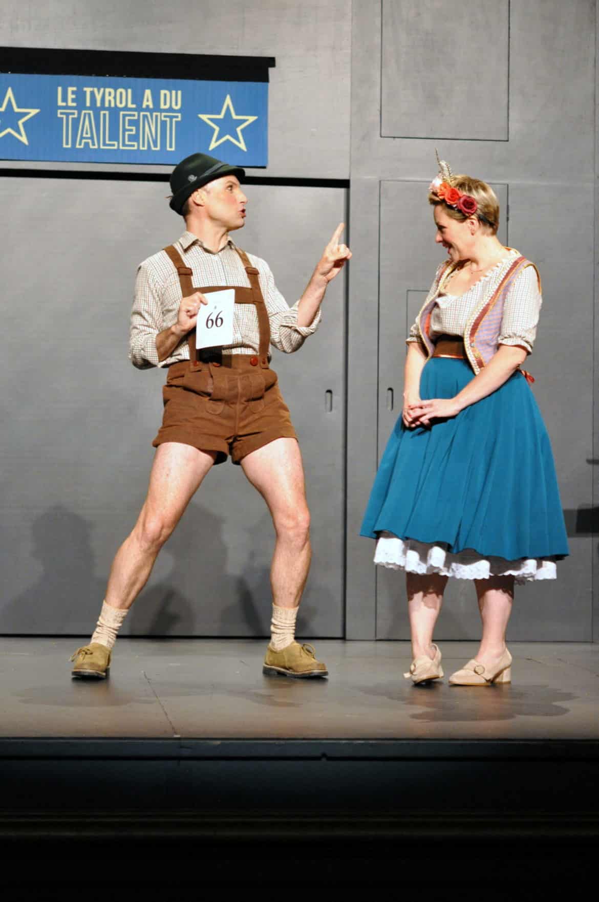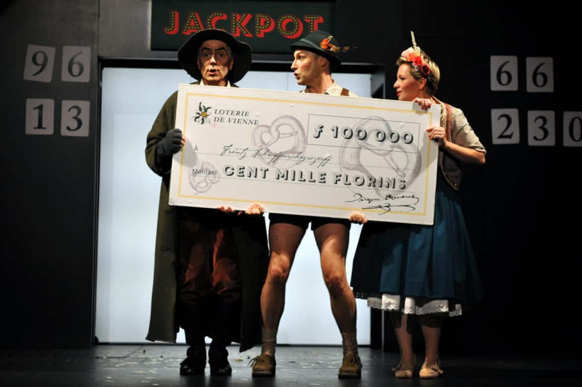 Concernant la mise en scène de Victoria Duhamel, c’est le terme astucieux qui, le premier, nous vient à l’esprit. Son minimalisme était au service de gags efficaces ; la majorité des événements scéniques fut assurée par un large panneau qui sert de toile de fond à la scène. Ce dernier servait tantôt d’aimant pour accrocher les numéros de loterie, tantôt de porte dérobée pour faire sortir un personnage, de large fenêtre dans lequel on pouvait apercevoir les montagnes du Tyrol, ou, enfin, de vitrine pour exposer des cibles mouvantes, ainsi qu’un large chèque de 100.000 florins à la manière d’un jeu télévisé. Thématiquement parlant, ce sont d’ailleurs toutes les topiques du jeu qui ont été convoquées : roue de la fortune, questions pour un champion, et l’on ne résiste bien évidement pas au slogan « le Tyrol a un incroyable talent ». Astucieuse, la mise en scène l’était enfin en souhaitant rallonger l’œuvre par de petites incursions extra-diégétiques (quelquefois peut-être au risque de trop couper la parole à l’œuvre), dans lesquelles le public était directement sollicité. Appelés par leur numéro de siège, les spectateurs avaient ainsi la possibilité d’entrer en interaction avec les personnages, répondant à des questions loufoques, ou devant jeter des balles (en mousse, rassurez-vous) sur les personnages pour choisir son favori.