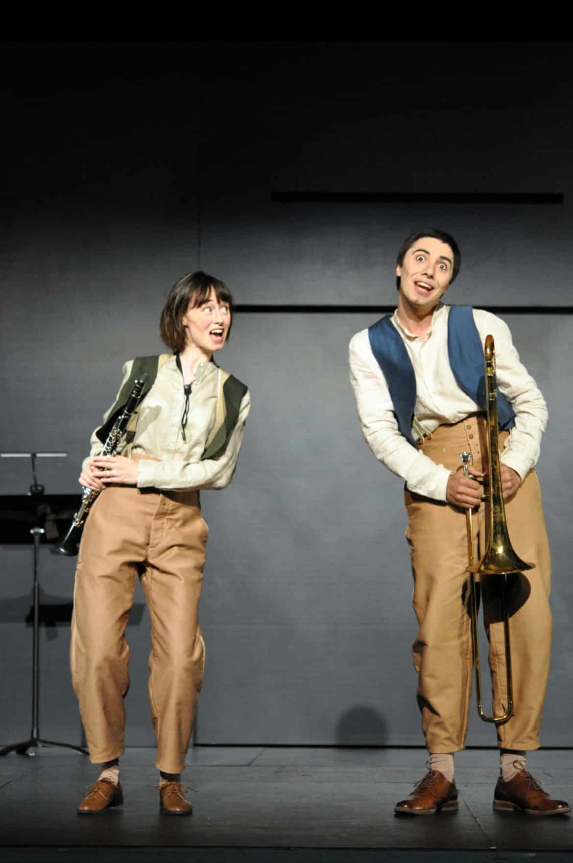 Cette recréation contemporaine de l’œuvre est donc bienvenue dans le paysage offenbachien, d’autant qu’elle a été placée sous le signe de la qualité, tant instrumentale que vocale. Si, en effet, la partition a été arrangée pour formation de chambre et qu’il n’a donc pu être possible de savourer les tuttis endiablés d’Offenbach, le pianiste (Martin Surot), la clarinettiste (Rozenn Le Trionnaire) et le tromboniste (Lucas Perruchon) ont toutefois largement donné le change : non seulement par une grande technique musicale, mais aussi par une présence scénique remarquable, étant sollicités directement par les personnages pour prendre part à l’action. L’itinérance continue dont ils ont fait preuve, passant par tous les recoins de la scène, leur a imposé d’exécuter certains numéros par cœur, ce qui démontre une grande implication pour des parties musicales qui pourtant ne se limitaient qu’à de l’accompagnement. Concernant les chanteurs, nous avons déjà eu le plaisir de comprendre la quasi-totalité du texte (ce qui est, malheureusement, assez rare pour le relever ici), bien que les R roulés soient encore une habitude de conservatoire qui nous semble superfétatoire, surtout dans l’optique d’une actualisation de l’œuvre ainsi que le suggérait la mise en scène. Les trois rôles vocaux, interprétés par Lara Neumann, Flannan Obé et Paul-Alexandre Dubois, ont ainsi été tenus avec grande solidité, tant dans l’agilité des vocalises que dans la tessiture. Tous possédaient une maîtrise vocale manifeste, ce qui leur permettait ainsi d’être à l’aise au niveau scénique et de proposer des incarnations fort plaisantes de ces personnages caricaturaux. Avoir l’occasion d’entendre de bons chanteurs d’un niveau équivalent est un nec plus ultra pour une œuvre inconnue. Si vraiment l’on voulait trouver à redire, on remarquera peut-être que certains sons étaient un peu trop poussés, non par manque de technique, mais sans doute par envie de démontrer la puissance vocale ; à cet égard, certains passages (notamment les cadences), auraient mérité une approche peut-être un peu plus subtile. Si, enfin, le passage en yoddeling restait convaincant, c’est néanmoins une technique qui gagnerait à être enseignée telle quelle aux chanteurs lyriques (surtout s’ils se destinent au répertoire comique), ce qui donnerait ainsi un plus grand sentiment d’immersion au lieu d’une impression détachée de belcanto.