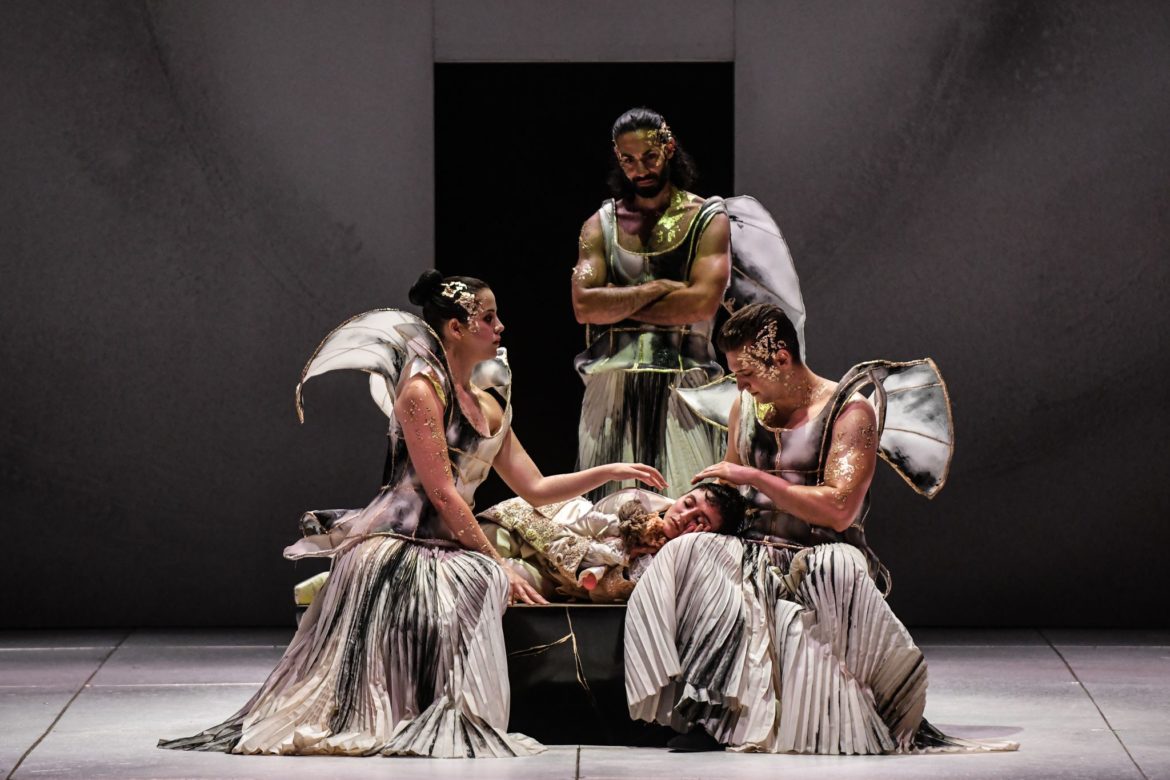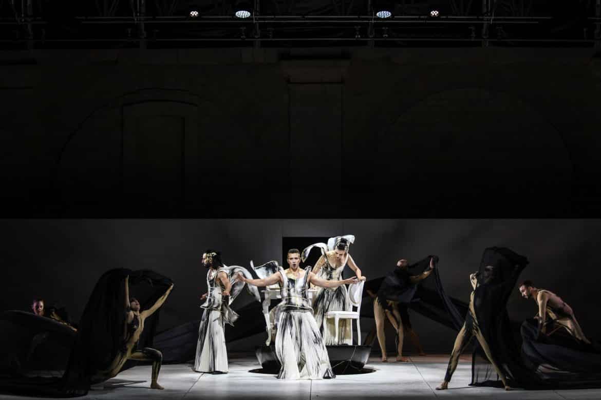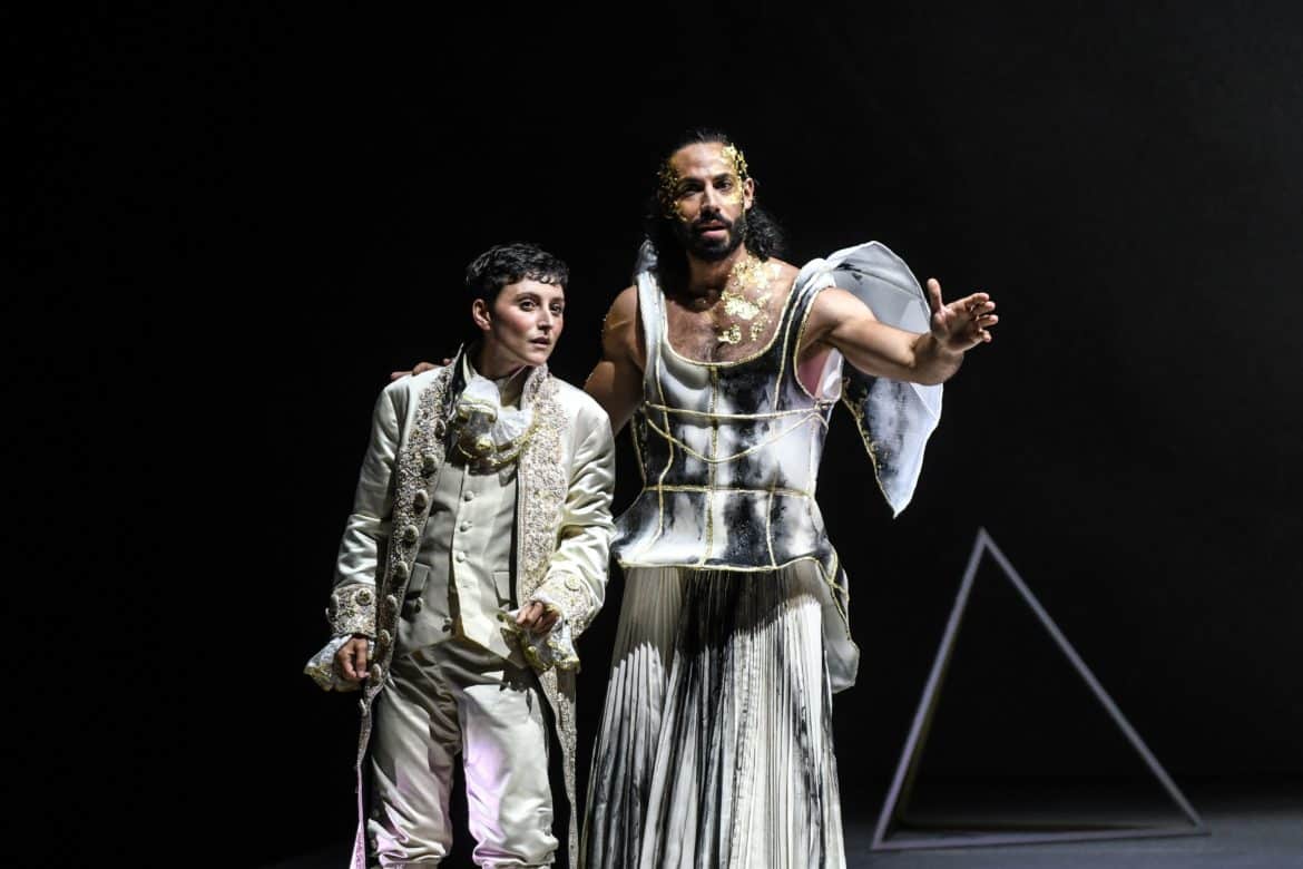 Si La création de Haydn n’appartient pas exactement à la catégorie des raretés et redécouvertes qui font tout le sel du Festival de Martina Franca depuis plus de quatre décennies, l’ouvrage reste peu joué en Italie, et c’est dans une version en langue vernaculaire, due à Dario del Corno pour le festival pugliese et reprise par son fils, Filippo, que l’oratorio est donné, dans le cadre d’une production réglée par Fabio Ceresa. Le genre même de la pièce, et son livret condensant les étapes essentielles du récit biblique sous la plume du baron van Swieten, n’appelle pas, de premier abord, une traduction scénique. Avec la complicité de la scénographie épurée mais non austère dessinée par Tiziano Santi et la chorégraphie de Mattia Agatiello, le metteur en scène italien décline, au fil de la partition, un kaléidoscope d’images et de symboles, que rehaussent les variations lumineuses modulées par Pasquale Mari. Quant aux costumes dessinés par Gianluca Falaschi et Gianmaria Sposito, ils réinterprètent habilement le dessin et les couleurs mythologiques trempés dans l’esthétique du Rococo, avec une touche plus contemporaine.