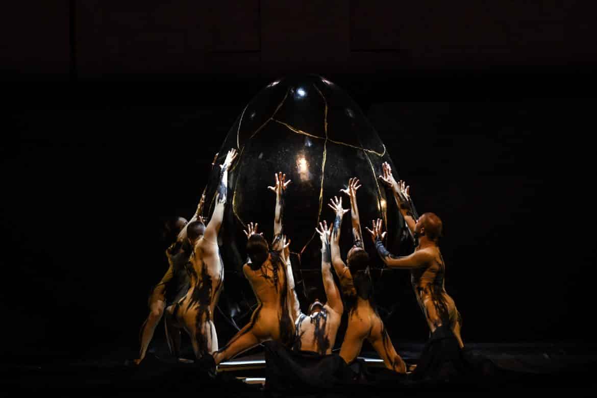 D’une indéniable fluidité formelle que l’on pourrait qualifier de galante, en synchronie avec celle de la musique, le propos ne manque pas de cohérence narrative, à défaut d’atteindre une véritable théâtralité, à laquelle, d’ailleurs, il ne prétend pas. Le chaos initial, avec les danseurs dissimulés sous les ondulations de tulle noir figurant les ténèbres, est articulé autour d’un mystérieux œuf d’ébène légèrement veiné et dont l’éclosion fera apparaître une figure juvénile d’allure androgyne, sinon asexuée : un avatar du Dieu façonnant le monde à la façon d’un apprentissage. C’est d’ailleurs sur une sorte d’élégant pupitre d’écolier arrangé sur l’œuf éclos que la divinité enfant verra se succéder les archétypes des sciences, les exotériques comme les plus occultes. Même si le flux ne permet pas de s’arrêter à chacun, on reconnaît une synthèse proche de l’époque des lumières, des solides platoniciens aux instruments maçonniques, très présents tout au long du spectacle, depuis le compas et le triangle, jusqu’à l’œil du Grand Architecte. Révélant un riche fonds référentiel, les mouvements chorégraphiques réservent de  beaux tableaux, à l’exemple du pommier dans la coque de l’œuf aux allures de Naissance de Vénus botticellien. Le duo entre Adam et Ève y répondra, et fera se rejoindre les deux moitiés d’une pomme, comme la complémentarité de l’homme et de la femme, dont un prolongement hérité du Banquet de Platon est illustré par trois couples de danseurs, illustrant les trois possibilités de combinaisons de genre. À chacun sera confié un œuf miniature, symbole probable de la fécondité de la création, dans un entrelacs entre Antiquité et contemporanéité sociétale.