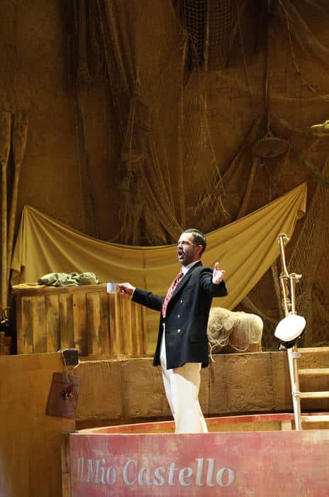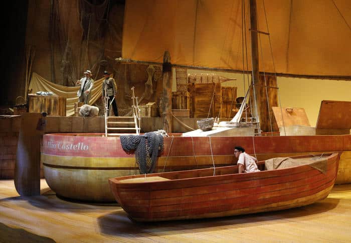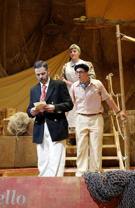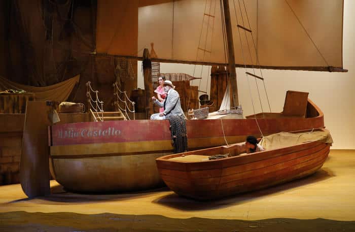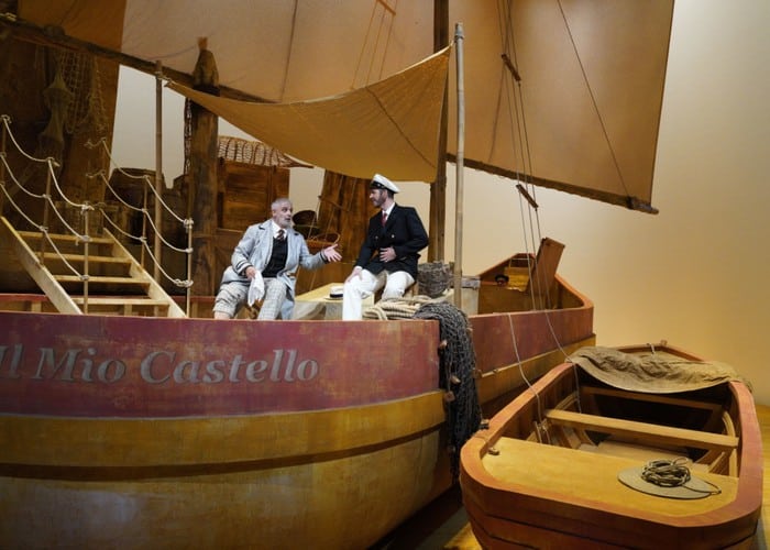 Seconde nouvelle production de l’édition 2021 du Festival de Pesaro, Il Signor Bruschino a été confié au collectif Barbe & Doucet, dont le récent Pelléas et Mélisande proposé à Parme la saison dernière avait séduit Marc Dumont. Les scénographe, costumier et metteur en scène ont transposé l’action dans les années 30/40, sur un bateau baptisé « Il Castello » dont Gaudenzio est le capitaine. Le rideau se lève sur un décor très réaliste (un quai inondé de lumière auquel est amarré le bateau, lequel se voit flanqué d’une petite barque sur laquelle s’isoleront les personnages pour certaines scènes plus intimistes) et, à l’heure où tant de metteurs en scène font systématiquement le choix de la laideur ou du minimalisme, on est tout de suite agréablement surpris et séduit par la beauté du dispositif (ainsi que par celle des jolis costumes d’André Barbe). La mise en scène sera à l’avenant : simple, élégante, amusante sans vulgarité : Quelques effets de tangage sur le Castello ou dans la petite chaloupe lorsque la situation se corse, une projection de spirales tournoyantes lorsque la situation vire à l’imbroglio et que la musique de Rossini se fait frénétique, de beaux jeux de lumière (signés Guy Simard) pour évoquer le miroitement des vagues ou l’évolution de la course du soleil, une direction d’acteurs très précise… et le tour est joué.