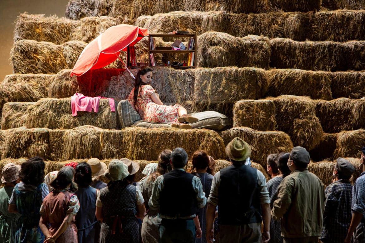 C’est un souci qui affecte en partie aussi l’entrée du Dulcamara de Carlo Lepore mais sa maîtrise du rôle et son admirable élocution imposent d’emblée un charlatan de fière allure qui nous donne également une extraordinaire leçon de chant dans le sillabato de la barcarole de l’acte II, avec Adina, et campe un retour désopilant dans le finale de l’œuvre. Giannetta percutante, Lucrezia Drei brille surtout dans l’ensemble de cette deuxième, voire troisième, scène de théâtre dans le théâtre où elle convoque les jeunes femmes du village afin de leur faire part de l’héritage que va bientôt toucher Nemorino.