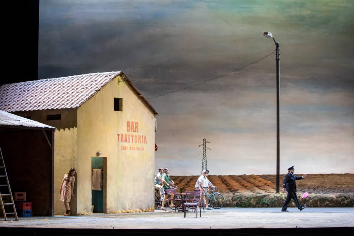 Dans le programme de salle, le metteur en scène semble presque récuser le décor qui s’est offert aux yeux des spectateurs pendant une quinzaine d’années (« Étrangement, tout le monde a vu dans cette campagne l’Italie des années 1960 »), en faveur d’une certaine universalité (« C’est un village perdu au milieu de nulle part »). Cependant, les uniformes des acolytes de Belcore évoquent bien la tenue des carabinieri dans les années 1950-1960, l’auberge s’appelle Bar Trattoria dell’incrocio, du carrefour, et surtout le rideau de scènes étale un patchwork de coupures de presse de journaux italiens faisant l’éloge des bienfaits du fameux élixir. D’ailleurs le réalisateur se contredit lui-même lorsque, plus loin, il fait allusion au cinéma néoréaliste italien. Ne nous trompons pas : ici nous ne sommes ni dans les marais pontins ni dans la Conca d’oro sicilienne mais bel et bien dans la Plaine du Pô des années 1950.