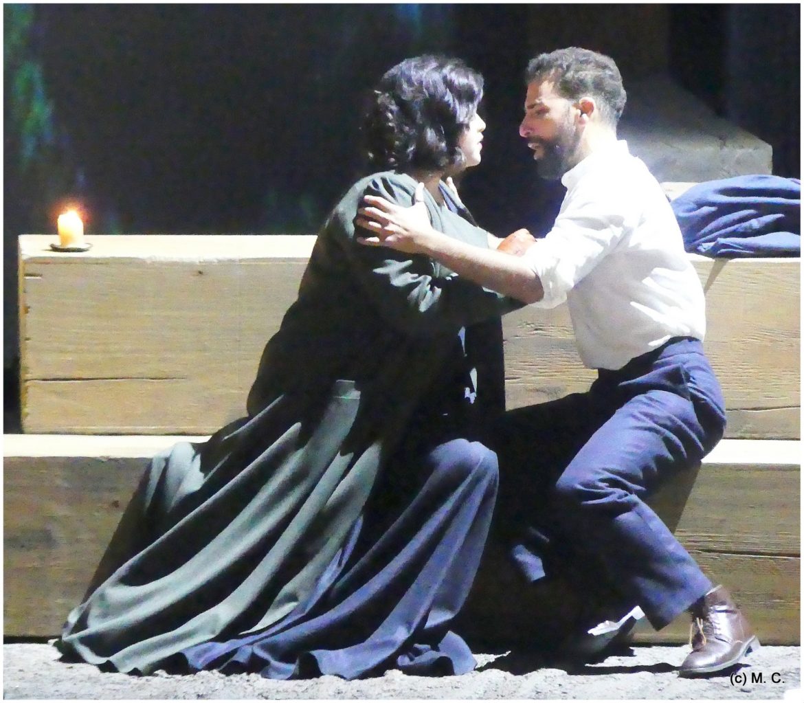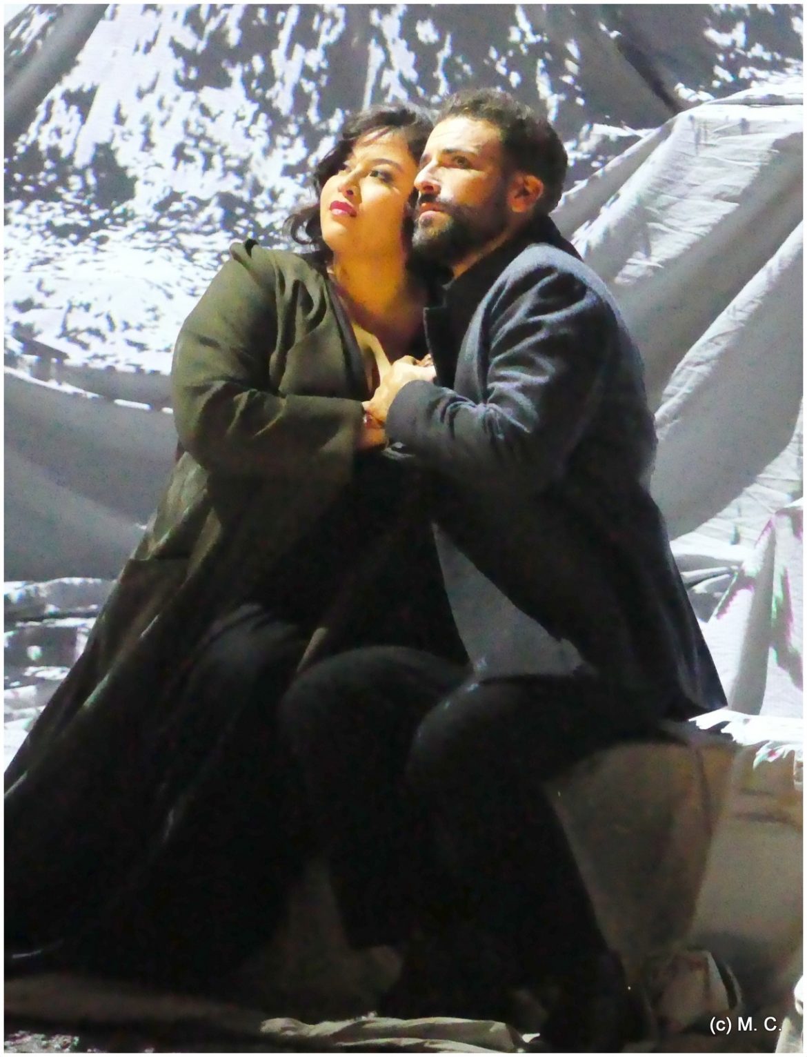 Restent, enfin, les trois rôles principaux. Il nous a semblé que la prestation d’Alexandre Duhamel est allée en s’améliorant au fil de la soirée : au premier acte, les registres ne sont pas toujours bien soudés, la diction est parfois un peu floue… Mais la voix se chauffant progressivement, le baryton parvient finalement à camper un très beau Tell, particulièrement émouvant au 3e acte, avec un superbe « Sois immobile », et surtout des répliques, après l’épreuve de la pomme (« Je ne vois plus, je me soutiens à peine ») vraiment touchantes dans la délicatesse et les nuances dont il les pare.