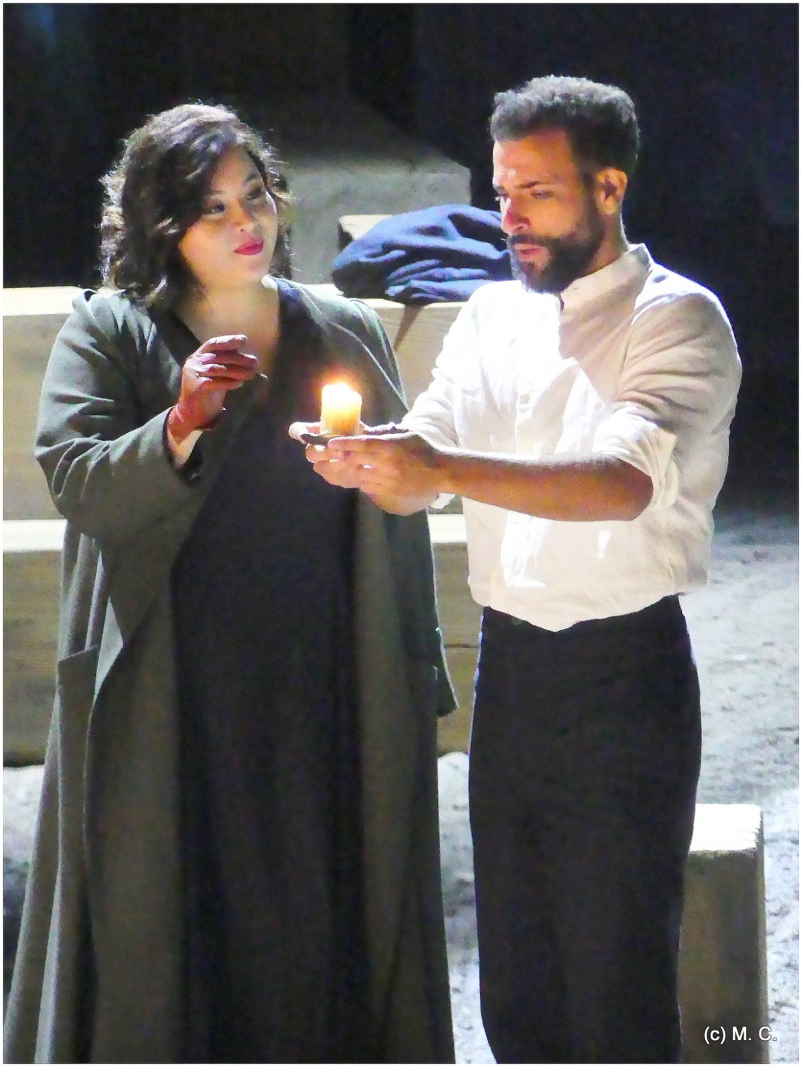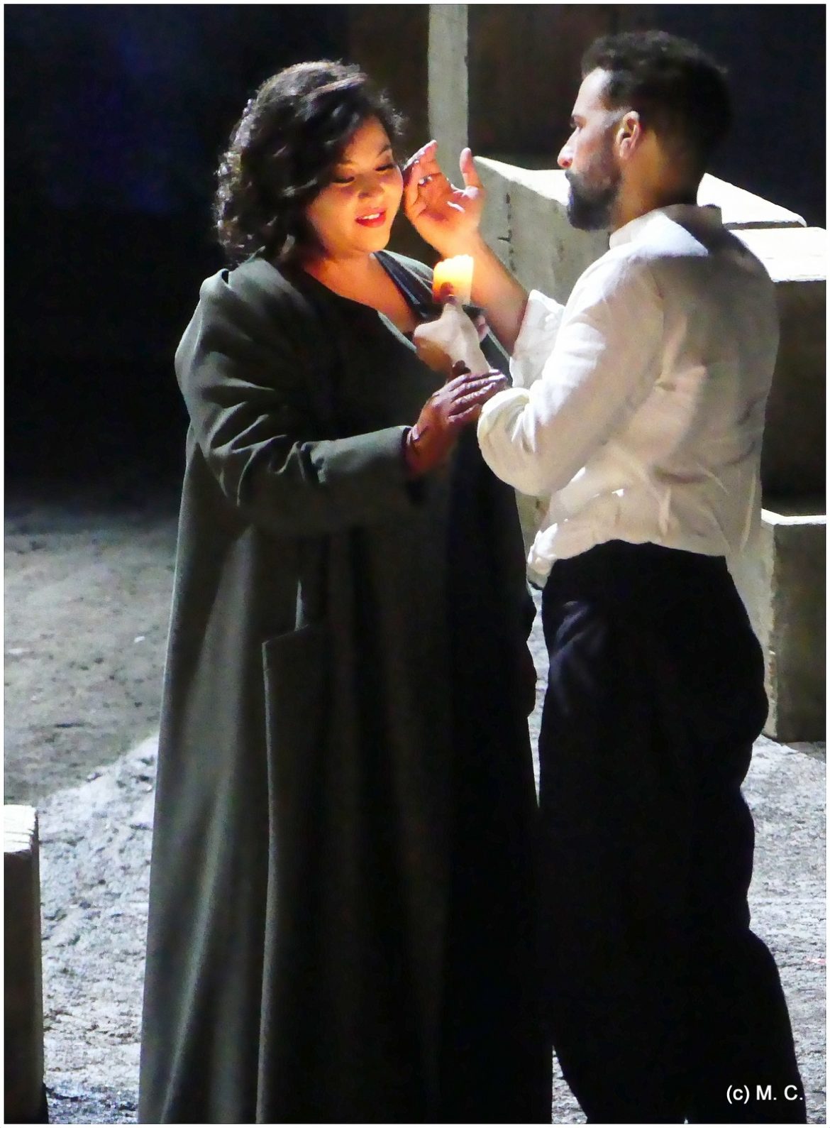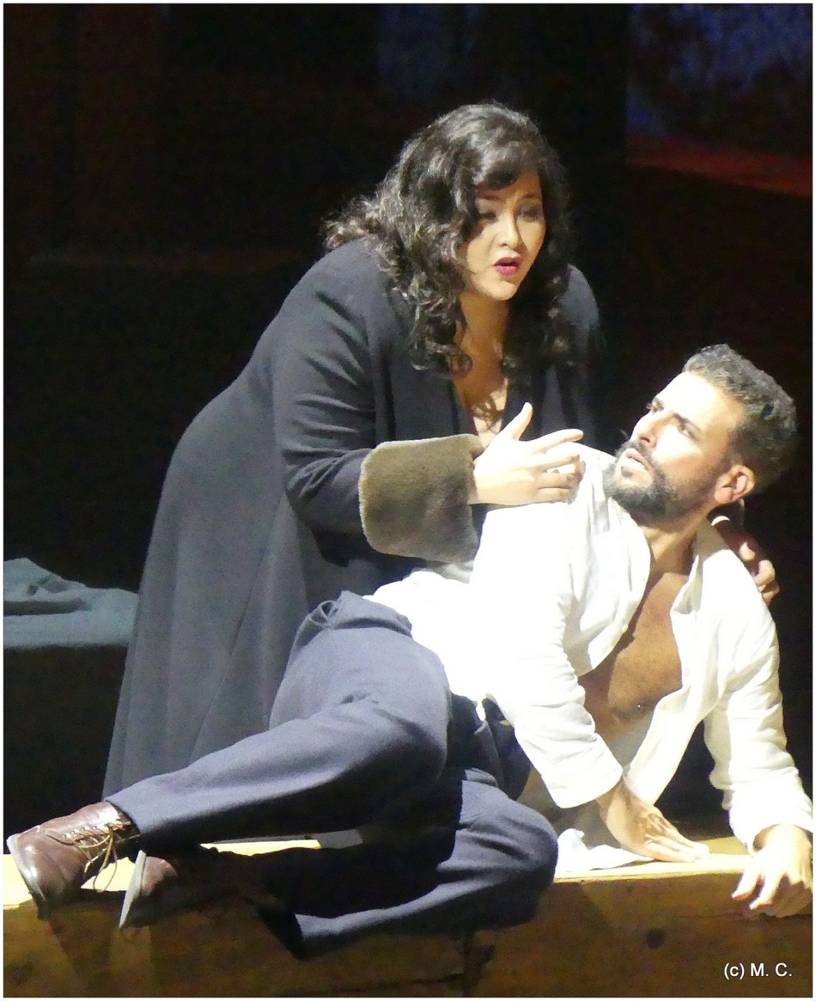 Enea Scala a ses aficionados, et ils étaient nombreux hier soir ! D’autres sont parfois moins convaincus par son chant, et ils se sont (très légèrement) manifestés à la fin du spectacle… C’est que le ténor semble parfois avoir deux voix : un grave et un médium chauds et séduisants, mais un aigu plus nasal et affecté d’un petit vibrato… ce qui séduit les uns mais agace les autres ! Quoi qu’il en soit, le ténor possède un français tout à fait respectable (l’émotion et la passion qui transparaissent dans son chant restent en revanche d’essence typiquement italienne !) et s’implique totalement dans ce rôle redoutable entre tous. Sachons lui gré, notamment, d’avoir (une fois n’est pas coutume…) préservé les deux strophes de « Amis, secondez ma vengeance ! », en proposant même de légères variations dans la reprise.