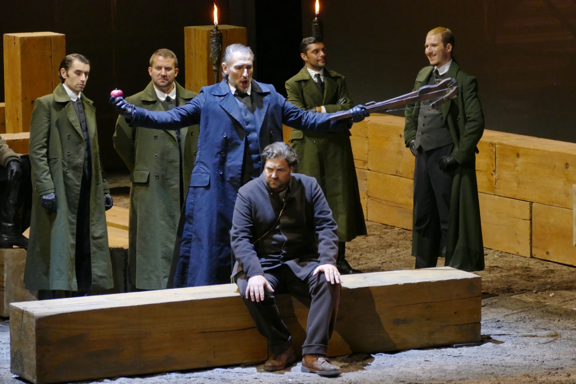 Pas facile de mettre en scène Guillaume Tell, œuvre assez statique sur le plan dramatique et dont l’arrière-plan historique parle peu au public d’aujourd’hui. Faut-il respecter le livret à la lettre ? Transposer l’action dans un univers plus proche du nôtre ? Se focaliser sur le personnage de Gessler, l’un des pires « salauds » du répertoire ? (C’est ce qu’avait tenté Tobias Kratzer à Lyon en 2019, dans un spectacle qui ne nous avait pas pleinement convaincu…) Ou encore respecter les grands traits du livret mais en stylisant l’aspect visuel du spectacle ? C’est cette dernière démarche qu’ont suivie Louis Désiré et Diego Méndez-Casariego, responsable des costumes et des décors, tout en accentuant eux aussi le côté cruel de Gessler, notamment lors du ballet de 3e acte. Ce ballet a de fait été rendu impossible par les conditions sanitaires. En lieu et place des scènes dansées, Louis Désiré a imaginé une pantomime : les couples de jeunes gens mariés au premier acte réapparaissent et, littéralement terrorisés, sont contraints malgré eux de se livrer à des danses devant Gessler et ses hommes qui les brutalisent tout en se moquant d’eux. La scène est directement inspirée du Salò de Pasolini (en beaucoup plus soft bien sûr !) et crée un certain malaise par le contraste qu’elle offre entre l’aspect guilleret de la musique et la terreur éprouvée par les personnages. On peut, au choix, s’en offusquer (sans pour autant aller jusqu’à interrompre le spectacle par des cris d’indignation… d’autant que la scène est infiniment moins choquante que celle qui suit – la fameuse scène de la pomme au cours de laquelle Gessler s’amuse à regarder un père devenir le possible meurtrier de son fils ! – et qui est, elle, prévue par les librettistes !), ou trouver au contraire le procédé intéressant en ce qu’il met en lumière le sadisme de Gessler. La scénographie (des caisses de bois occupent l’essentiel de l’espace, leur agencement permettant de délimiter certains lieux plus ou moins évocateurs) n’est quant à elle pas des plus séduisantes à l’œil (notamment au premier acte), mais elle est assez fonctionnelle, surtout lorsque quelques éléments de décors ou quelques accessoires viennent la compléter. Si la mise en scène recourt à une symbolique parfois un peu facile, le jeu des acteurs est particulièrement travaillé. Mais cela ne suffit pas toujours, hélas, à donner une véritable urgence à l’action ou aux situations représentées…