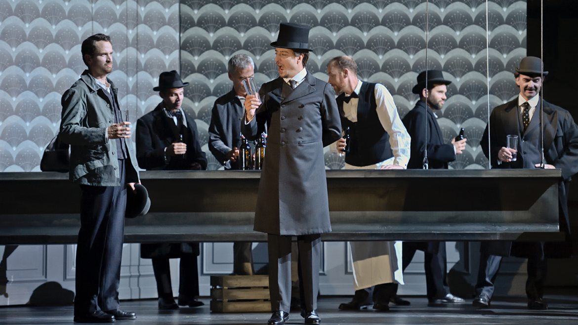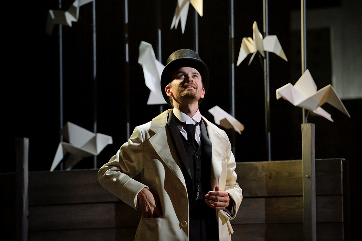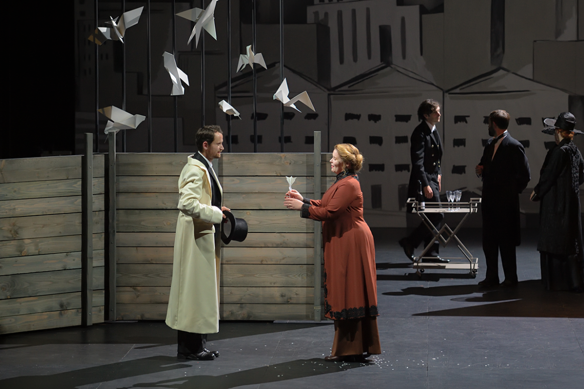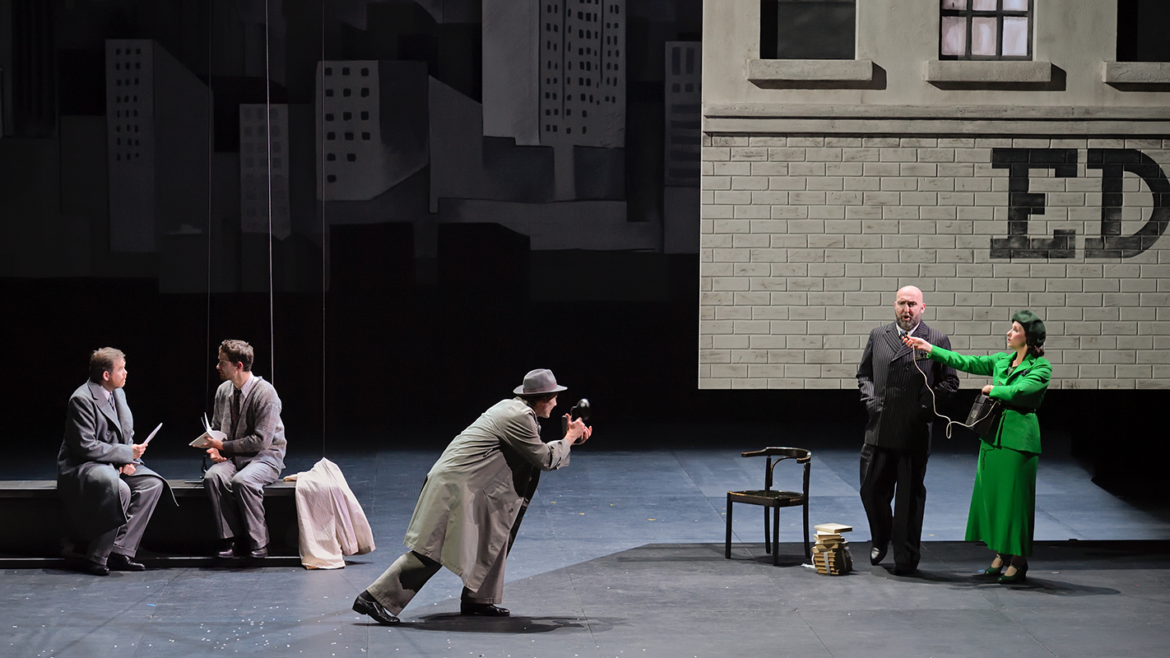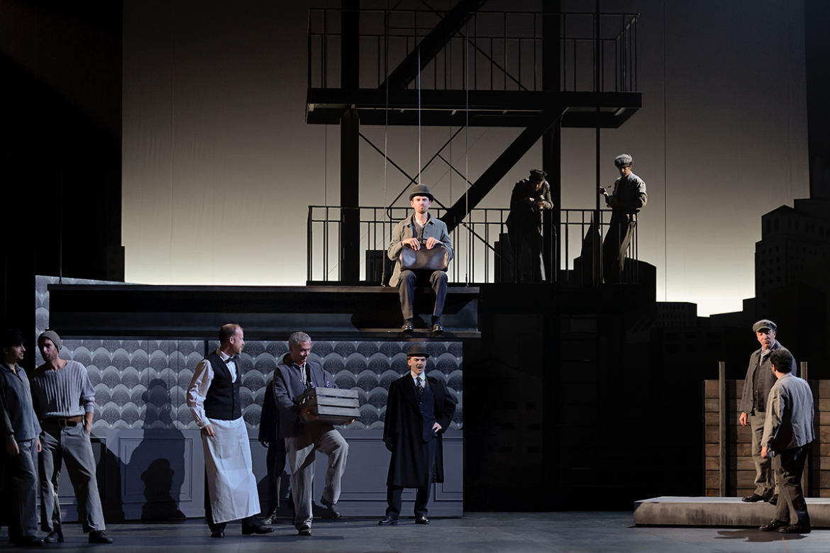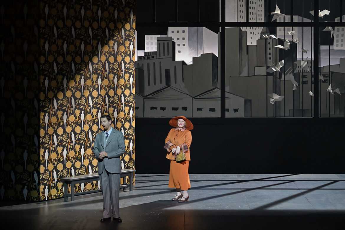 La production scénique offre un écrin particulièrement soigné aux épisodes de ce qu’on qualifiera de « biopéra » (comme le 7e Art parle de « biopic »). Dans un noir et blanc moins cinématographique que graphique tout court (on songe au travail de Tardi illustrant Voyage au bout de la nuit), le décor et les costumes des personnages multiplient les citations de l’Americana : passerelle de paquebot, skyline de New York, escaliers de secours façon West Side Story, photos de Walker Evans ou de Charles Clyde Ebbets (l’iconique Luch In The Sky) en passant par l’effrayante chaise électrique de Warhol. Seules se voient parées de couleur les deux protagonistes féminines du récit, Betty et Ethel, qui tour à tour se disputent les faveurs de l’ingénieur. Mais ce dernier ne semble capable d’éprouver l’amour que pour ses machines ou pour les oiseaux, ses « alliés singuliers ». C’est du reste sous leurs auspices que s’ouvre et se clôt le récit de ce destin hors-norme, des cris des mouettes saluant l’arrivée de Gregor dans le port de New York aux roucoulements des pigeons, devenus seuls témoins de sa déchéance.