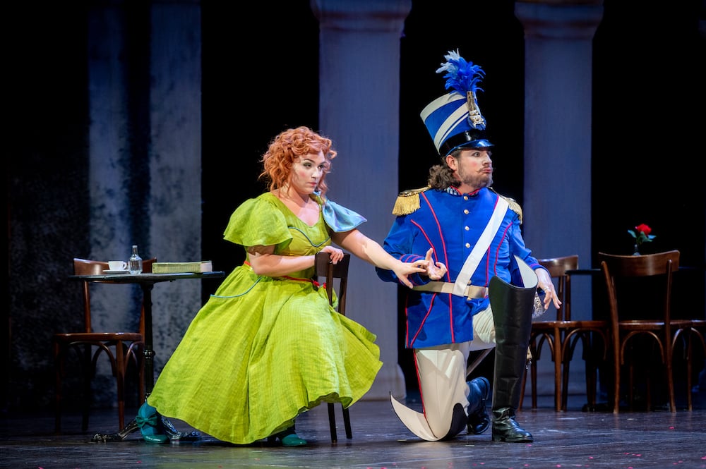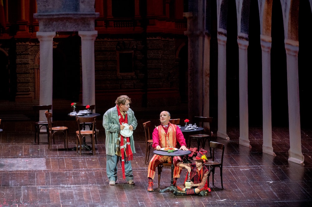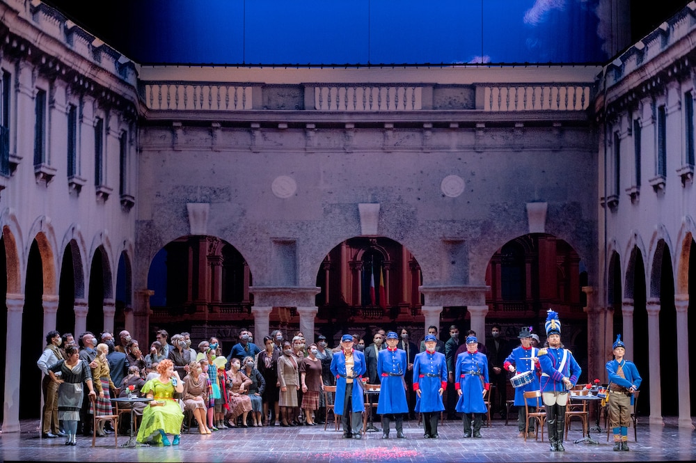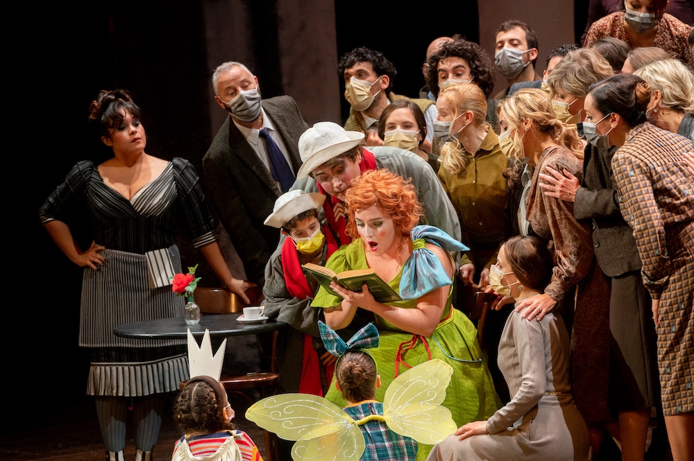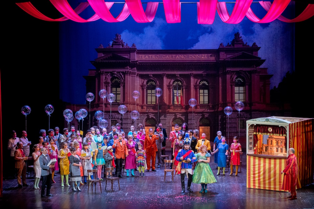Mais c’est avec le véritable Elisir d’amore que s’ouvre le festival commence, alors que le théâtre Donizetti est inauguré après d’importants travaux de rénovation. Avant la représentation, un orchestre jouant la musique de l’opéra attire les passants pour une représentation du théâtre de marionnettes de Daniele Cortesi, que l’on retrouvera ensuite sur scène, qui présente les aventures de Nemorino & Co. « aux jeunes et aux moins jeunes ». Cette implication de la ville est un des nombreux mérites de ce festival, qui transforme Bergame en un Salzbourg piémontais grouillant d’étrangers, lesquels, cette année encore – et malgré la pandémie – constituent le noyau dur du public de la manifestation. L’air de fête qui règne à l’extérieur se retrouve dans le théâtre, dans les nouveaux locaux et dans la salle rénovée : les spectateurs reçoivent des petits drapeaux avec le texte du refrain du chœur par lequel l’opéra reprend après l’entracte. Tout le public est ainsi impliqué dans l’événement, et chante joyeusement « Cantiamo, facciam brindisi a sposi così amabili« .