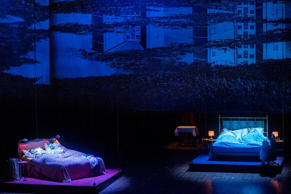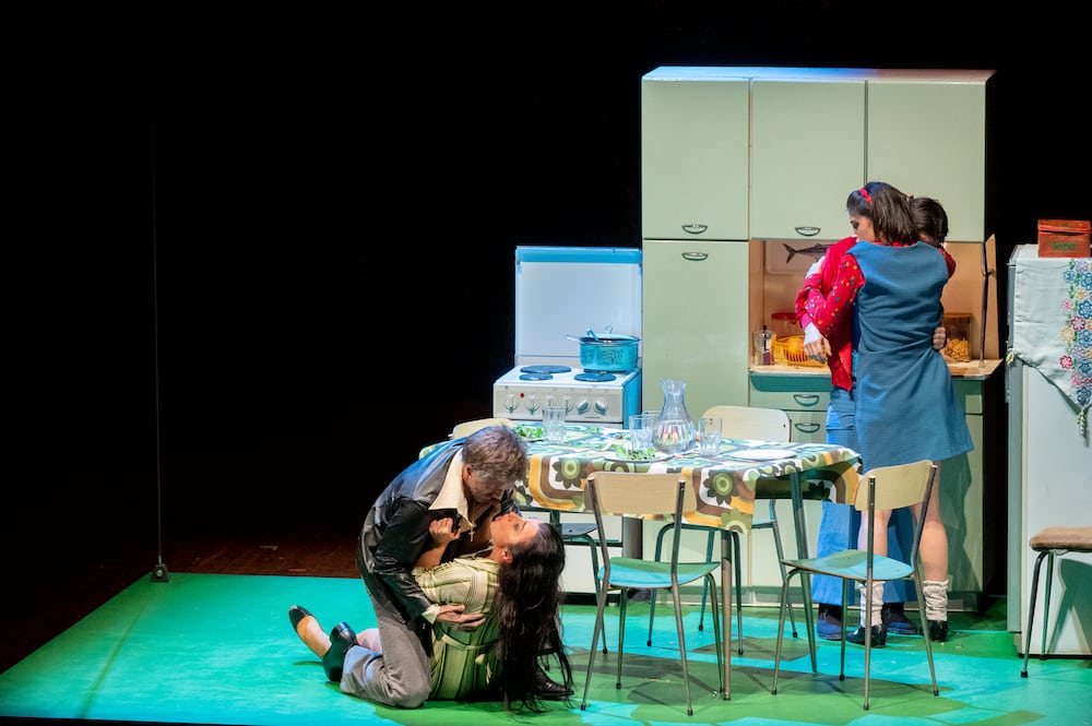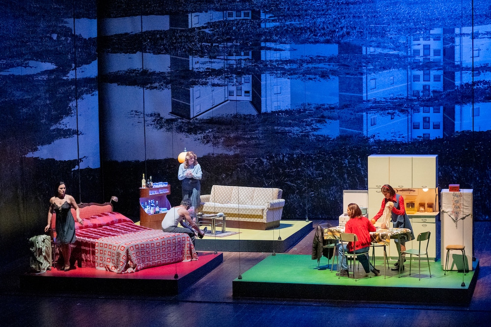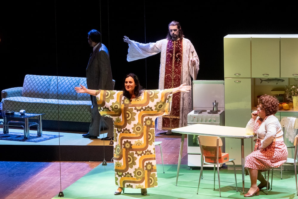 La mise en scène est confiée au directeur artistique du festival, Francesco Micheli, qui a créé un spectacle intelligemment provocateur en choisissant de placer l’histoire mythologique dans un cadre bourgeois des années 1970, les silhouettes des immeubles municipaux du quartier Monterosso de Bergame se reflétant dans les flaques d’eau de la scénographie d’Edoardo Sanchi. Quatre plateformes descendent des cintres pour constituer la cuisine, le salon et les chambres à coucher des deux couples. L’ameublement est dans le style de l’époque avec les tissus imprimés caractéristiques des draps et de la nappe – cette dernière, découpée et cousue, devenant le vêtement qui tuera Creusa….