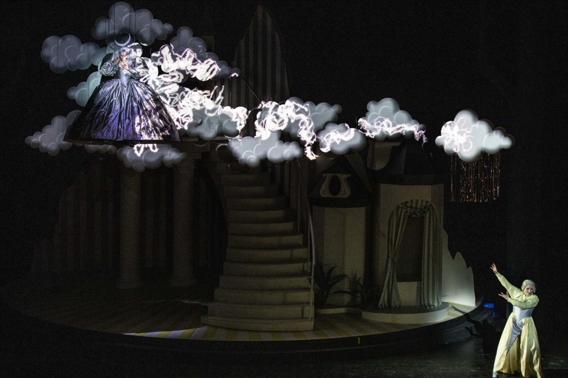 Afin d’éviter à son spectacle l’écueil de la ringardise, Anna Bernreitner habille ce décor très classique de projections cartoonesques qui lui donnent vie. L’utilisation de la vidéo permet à la metteuse en scène de dresser de jolis tableaux parmi lesquels on retiendra le combat de Tamino contre le serpent, la première apparition de la Reine de la Nuit, au centre d’un grand ciel étoilé, et le combat de sortilèges auquel se livrent Pamina et sa mère pendant l’air « Der Hölle Rache ». Il n’empêche cependant que les deux esthétiques – la classique et la moderne – ont du mal à coexister, le réalisme cru des projections vidéo s’accordant mal à la poésie désuète mais charmante des décors en carton-pâte.