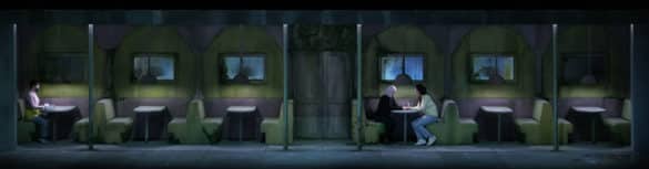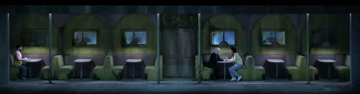 La scène s’ouvre ainsi sur un très beau tableau de bagarre qui se déroule à mi-hauteur pendant l’ouverture. Pour une fois, le méchant n’est pas l’envahisseur romain. Apparaît alors Pollione en bon père de famille, rendant visite à ses enfants cachés, présents sur le plateau pendant que s’installe le public, jouant avec des personnages et des animaux en plastique issus sans doute d’un film de science-fiction ou d’un jeu-vidéo. Les membres de la secte, les Gaulois du livret, se transforment en loups et on brûle un corps vivant, emmailloté dans une toile thermique. Une voiture prend feu. On comprend que le chœur, donnant la réplique à Oroveso à la scène suivante, revient de ladite bagarre. Plus tard, lors de la prière à la lune, la divinité est représentée par les feux d’une auto descendant du ciel. Adalgisa attend son bien-aimé dans un véhicule d’où elle sort, heureusement, le temps de leur duo dont la strette se termine néanmoins à l’intérieur, de manière à suggérer l’effusion d’amour, un savant jeu de balancement faisant néanmoins tourner l’habitacle à la verticale, permettant une meilleure projection de la strette. Le premier duo entre les deux rivales, menant au trio du finale I, se passe sur la terrasse d’un restaurant miteux, les tables vert pâle en enfilade façon fast-food, ce qui permet de justifier l’apparition soudaine de Pollione, puisqu’il boit un verre avec Flavio, un peu plus loin. Pendant l’affrontement du triangle amoureux un enchevêtrement de carcasses de voiture descend des cintres.