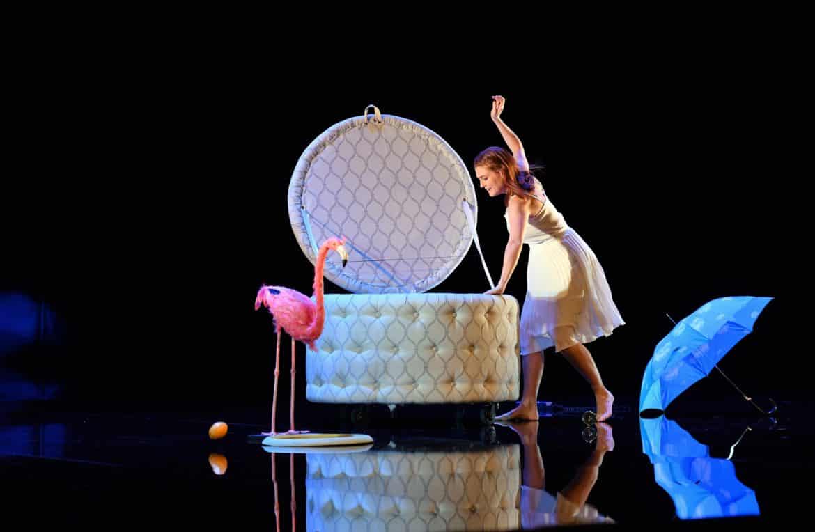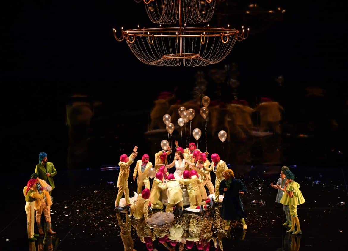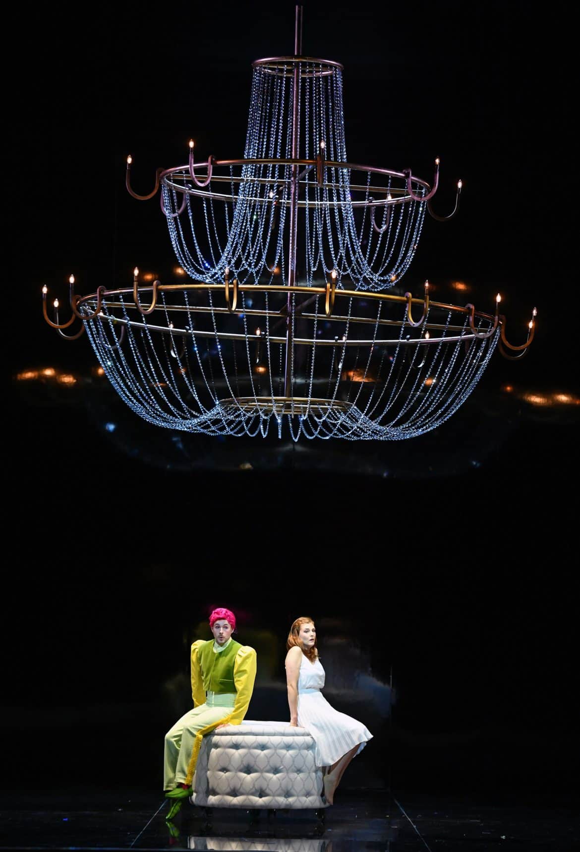 Si nous devions malgré tout rendre justice à la mise en scène, nous parlerions ainsi de ses quelques idées phares qui ont donné de la valeur ajoutée à l’œuvre. Bien que le parti pris fût minimaliste, il n’a pas empêché de faire éclore certaines riches idées. Ainsi, l’immense lustre qui conduisait l’ensemble des tableaux a pu assurer différentes fonctions selon les besoins de la situation. D’abord simple lustre bancal pour convenir au manoir en ruines de Don Magnifico, il est ensuite descendu sur scène, emprisonnant Angelina pour l’empêcher de sortir au bal. Enfin, aidé de jeux de lumières (celles de la scène, et, plus intéressant encore, celles de la salle), il a figuré la temporale de l’acte II par différents éclats de couleurs symbolisant le tonnerre. Nous soulignerons également un élément très bienvenu par rapport aux traditionnelles mises en scène rossiniennes : les différents ensembles de stupéfaction (dans lesquels le livret suggère que les personnages sont face à un coup de théâtre et en proie à la folie) n’a pas été scénographie par le sempiternel tableau de personnages immobiles. Alicia Geugelin a en effet eu l’audace de faire pour ces moments des propositions scéniques, leur offrant alors une vraie dramaturgie. C’est donc avec plaisir que nous avons pu assister à de véritables chorégraphies là où il est d’ordinaire coutume de cesser tout mouvement au profit de la musique. Enfin, nous tenons à indiquer qu’il a fallu attendre jusqu’à la moitié du second acte pour qu’un personnage s’allonge par terre en chantant — ce qui, dans les mises en scène contemporaines, relève de l’exploit. Pour nuancer cette nouveauté apportée par la mise en scène, nous évoquerons le caractère sans cesse hystérique des personnages. Certes, il est de bon ton de tourner les protagonistes rossiniens en des déséquilibrés, mais il a été ici dommage que ce pathologisme se retrouve jusque dans les (quelques) scènes sérieuses de l’opéra. Nous aurions ainsi préféré assister à la sincérité de l’échange amoureux entre Angelina et Don Ramiro lors de leur rencontre à l’acte I, et savourer la vengeance de la nouvelle reine, toute constituée de pardon, lors du final de l’acte II, sans que l’ensemble des convives ne gesticulent nerveusement à chaque groupe de double-croches.