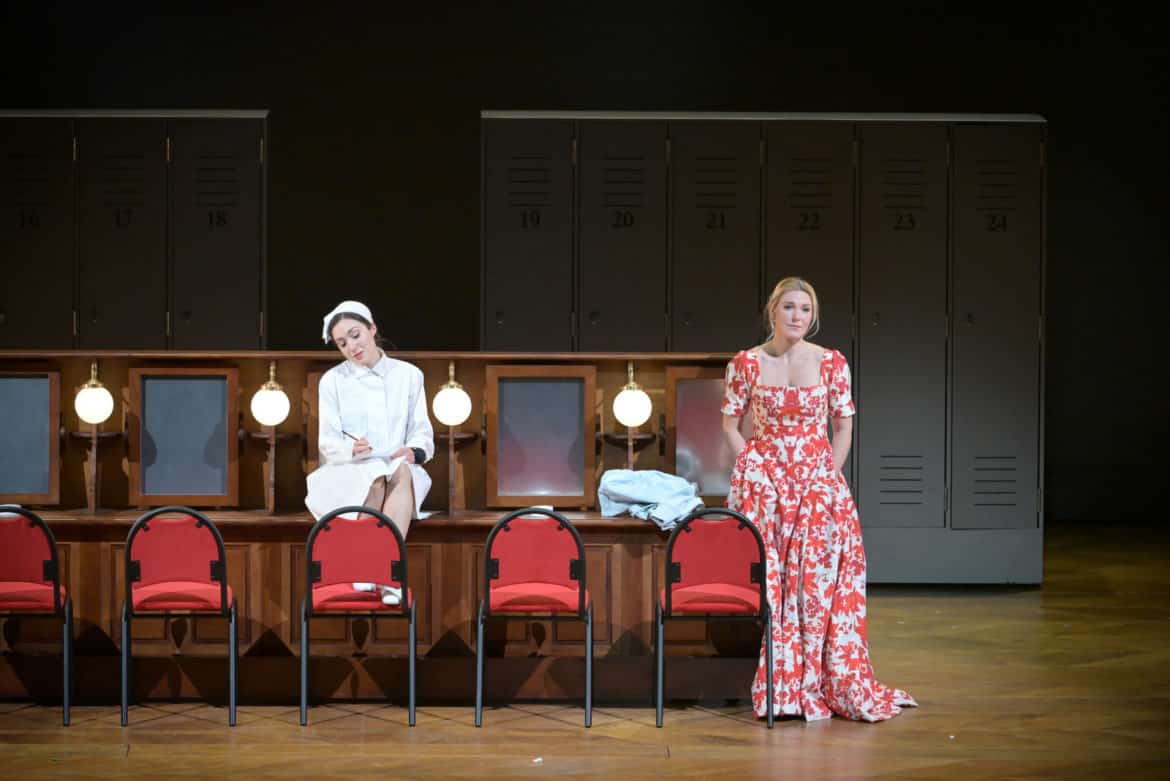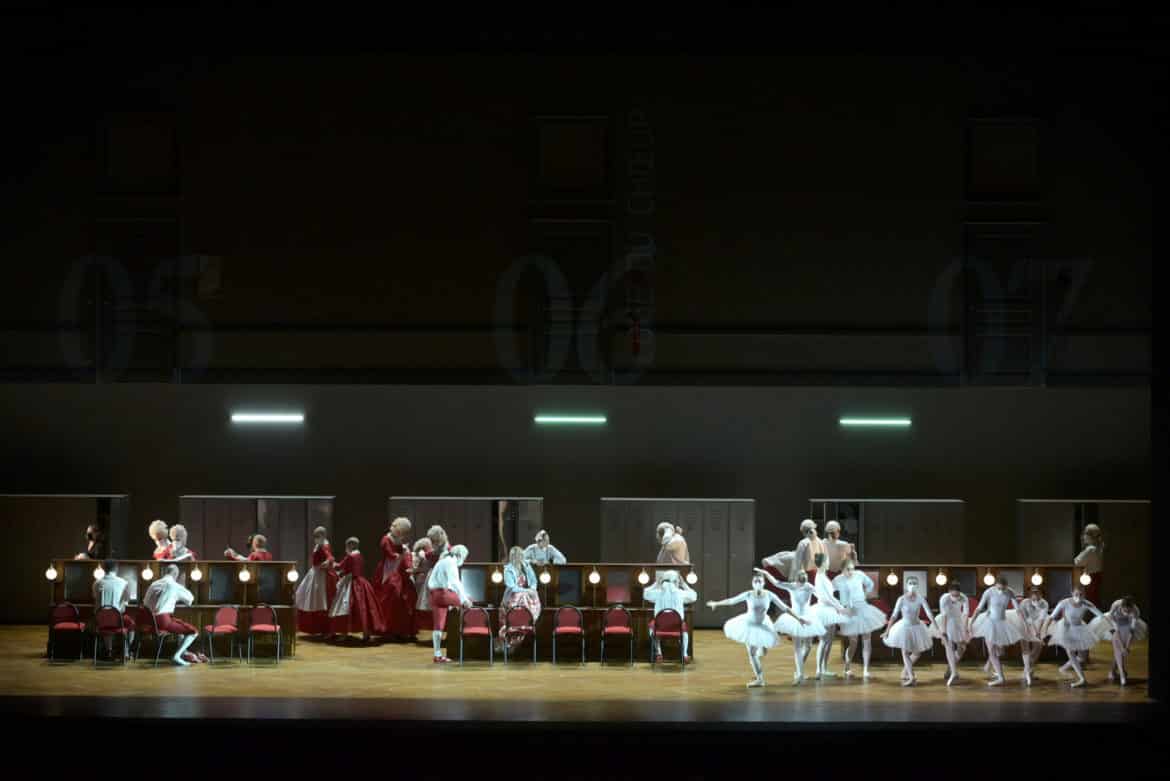 Et pour défendre cette autre facette de la production, quoi de mieux que de déshabiller tout le monde ? Susanna en sous-vêtement rouges dès son duettino de l’acte I avec son futur époux, simulant un acte sexuel vite interrompu, la Contessa en culotte et soutien-gorge bleu clair, ôtant sa robe au début de l’acte II, Figaro et Almaviva en caleçon, ce qui ne peut que nous faire constater que le premier a de plus belles cuisses que le second, Cherubino lors de ses multiples déguisements. Le comte danse alors avec une jeune fille, pendant que son serviteur s’imagine le défier (« Se vuol ballare ») : l’un des nombreux visages de Susanna. Au précipité entre le premier et le deuxième acte, la silhouette d’Alfred Hitchcock traverse rapidement la scène, bientôt suivie d’une toute petite Audrey Hepburn, à moins qu’il ne s’agisse encore du Conte et de la camériste. À la scène finale, les noces, apparaît au loin le grand foyer du Palais Garnier, où dansent les petits rats de l’Opéra : que des jeunes filles dont l’une tombe malencontreusement ; est-ce Susanna, enfin prise dans les filets du comte, voire de Figaro ? Le public s’amuse, applaudit et, pour une fois, ne hue pas la réalisatrice au moment des remerciements. La mise en scène fonctionne.