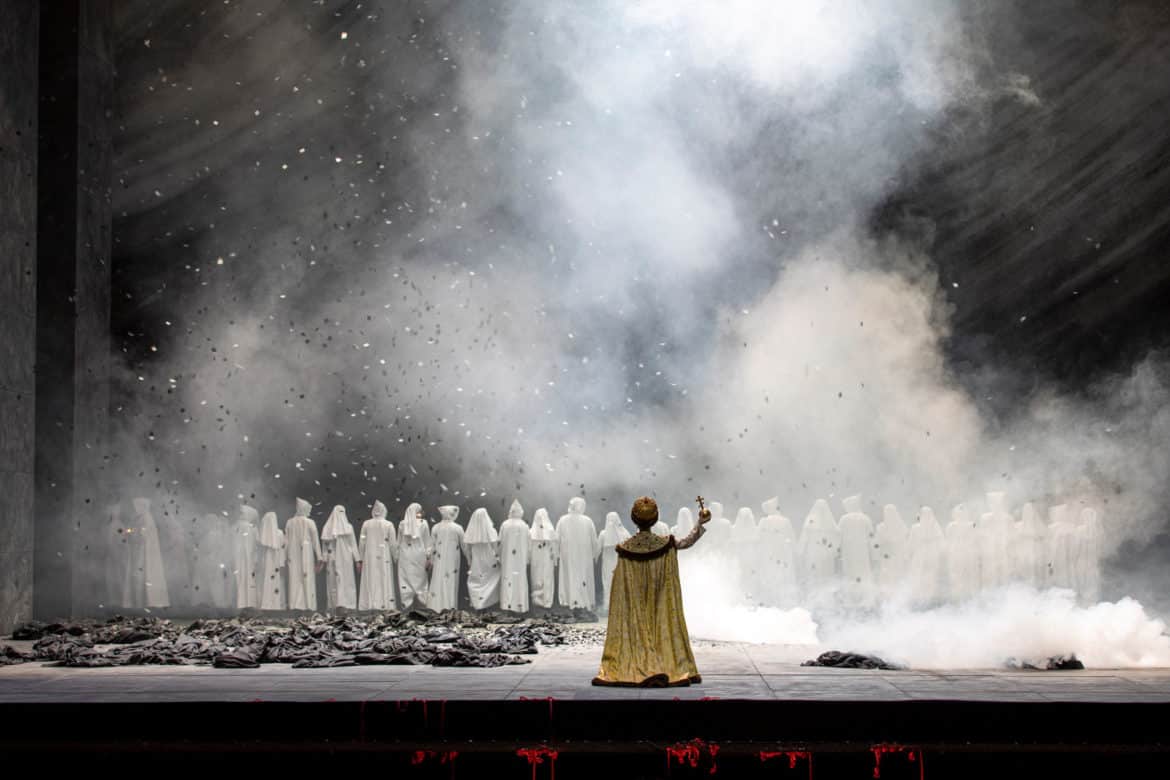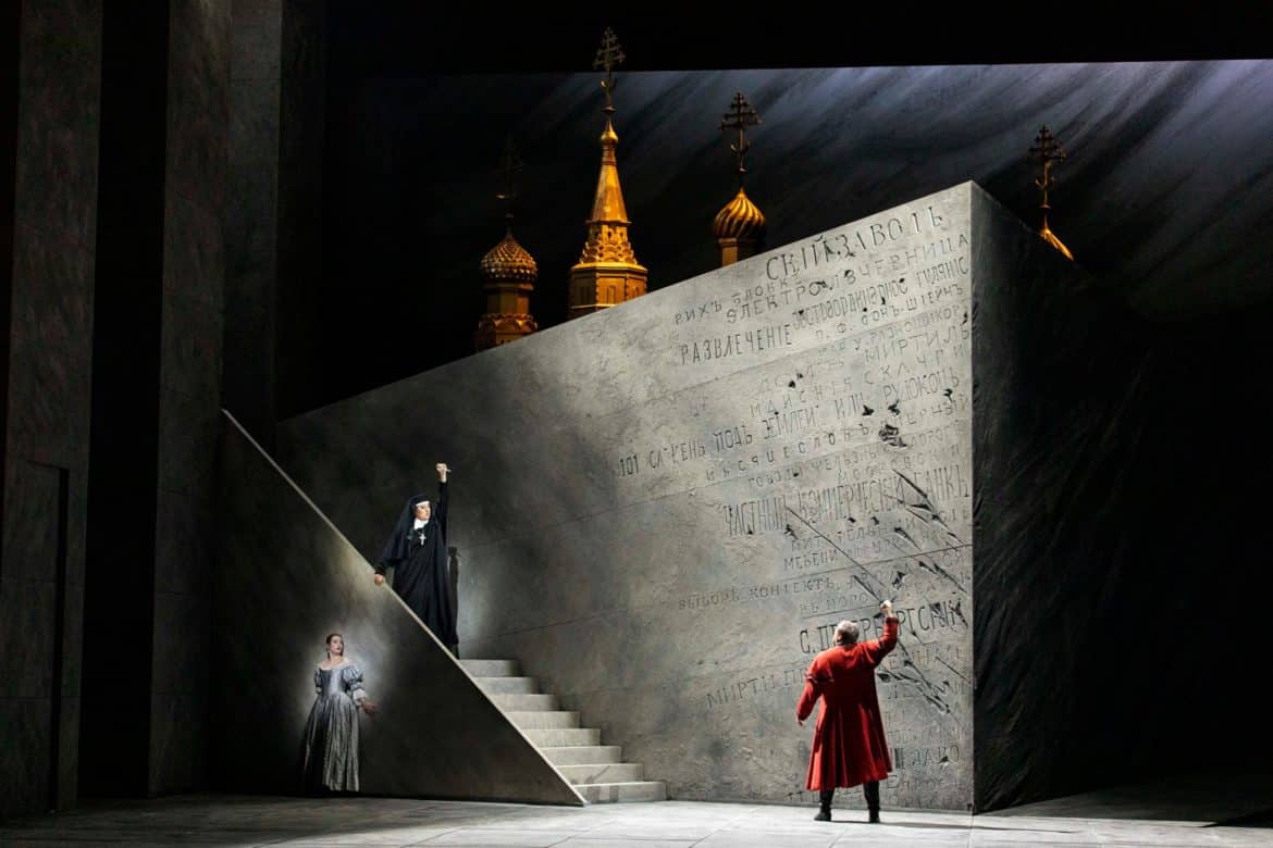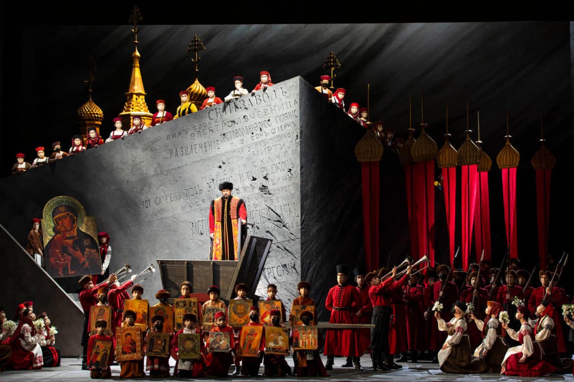 La mise en scène d’Andrei Serban nous plonge dans la Russie féodale du XVIIe siècle avec ses costumes flamboyants et ses décors monumentaux. De la scénographie de Richard Hudson quelques éléments forts marquent durablement le spectateur. Cet abord de la Place rouge, immense bloc de béton gris, au pied duquel se joue le destin de tout un peuple. Le salon au mur fissuré du prince Golitsine, arène de jeu des puissants et des égos. L’émouvant et étouffant tableau final aux ombres d’arbres inquiétantes. Et, ce petit Tsar s’avançant face à son destin dans la fumée et les cendres du bûcher des Vieux-Croyants. Tout n’est malheureusement de cette même eau dans le travail d’Andrei Serban et l’on regrettera quelques scènes de foules peu inspirées, des passages d’étendards redondants, un feu d’artifice curieusement maigrelet et quelques coups de balais appuyés. Le metteur en scène aura au moins eu le mérite de laisser toute sa place à une intrigue, si ce n’est complexe, disons quand même pour le moins touffue mais tout à fait lisible pour qui prendra le temps des deux entractes de ce spectacle de près de quatre heures pour se plonger dans le livret de l’œuvre.