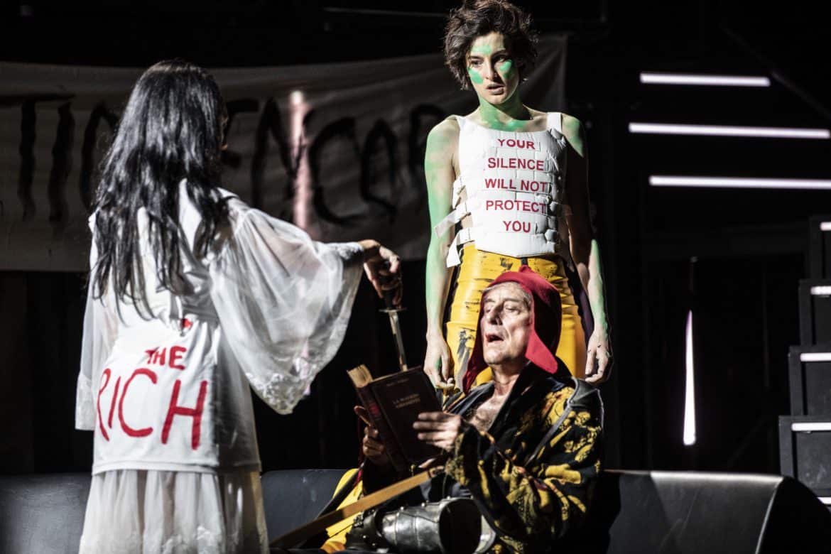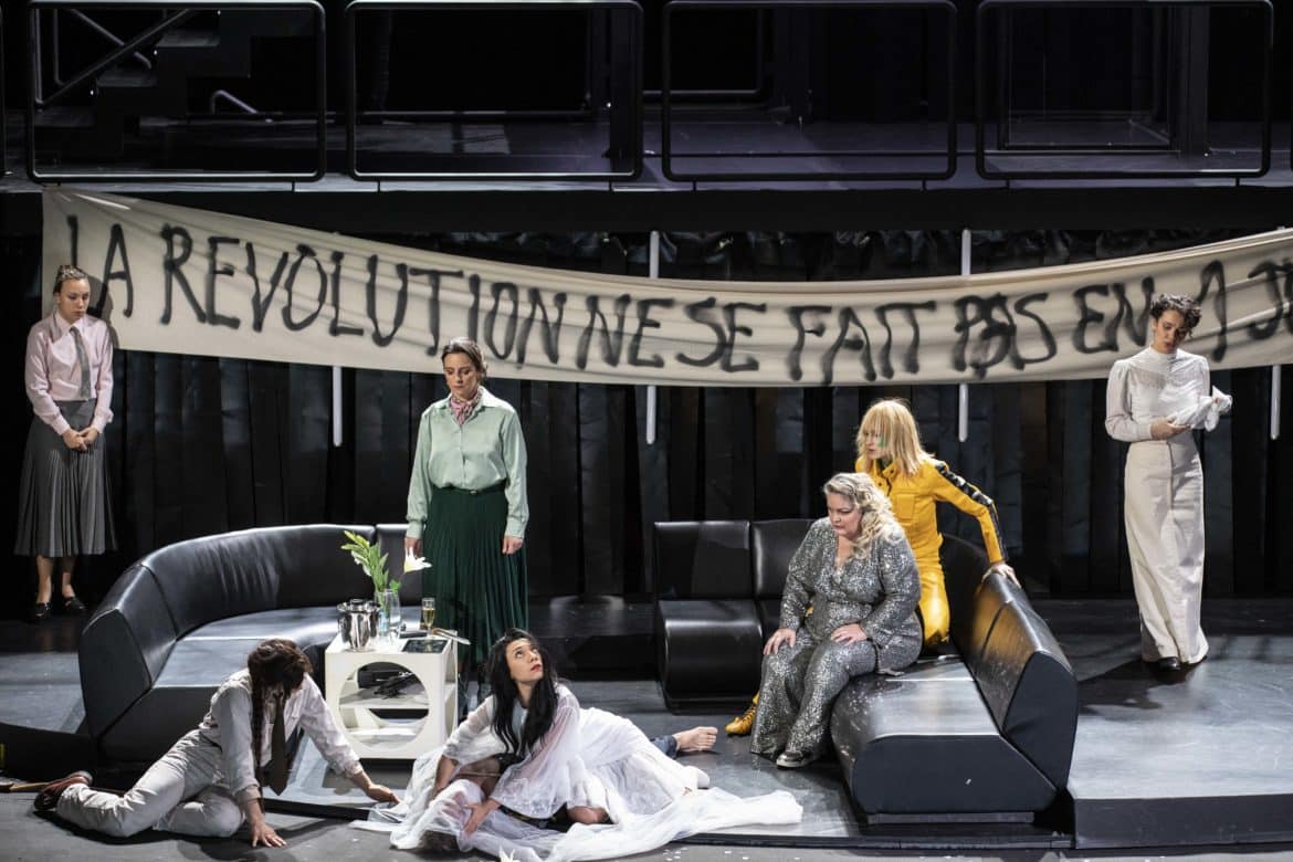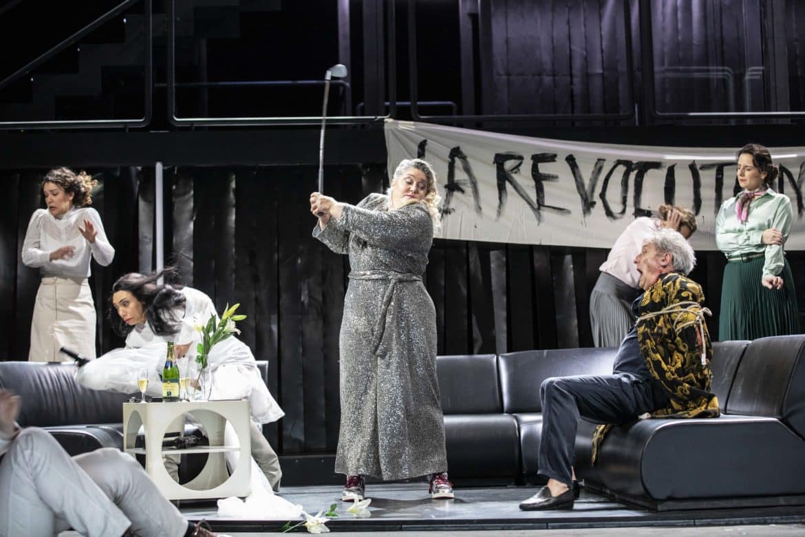Une fois dûment balancé, le Porc peut et doit être rééduqué. Telle est, semble-t-il, l’une des leçons qu’il faut tirer de la nouvelle production d’Ariane et Barbe-Bleue présentée à l’Opéra de Lorraine. Si Ygraine, Bellangère et les autres refusent finalement de quitter le château, c’est parce qu’elles ont l’intention de faire subir à leur tortionnaire une sorte de révolution culturelle : passé à tabac par les paysans (croisement de Gilets Jaunes et d’attaquants du Capitole de Washington), menacé par le club de golf que lui a confisqué Ariane, affublé d’un bonnet phrygien, Barbe-Bleue ne sera pas envoyé en camp de travail, mais sera obligé de se plonger dans de saines lectures qui lui feront prendre conscience que tout a changé. Dans cette grande villa où se déroule l’action – beau décor signé Nina Wetzel, tournant et parsemé de néons, comme ceux de Pierre-André Weitz –, les cinq premières épouses rêvent déjà de révolte car, lors de l’ouverture des portes, une vidéo réalisée en direct nous les montre adoptant divers déguisements de femmes rebelles. La rébellion se concrétisera au dernier acte, lorsqu’elles prendront le costume de leurs modèles, suffragette, Greta Thunberg ou Uma Thurman dans Kill Bill. Vêtements et décors se couvrent de slogans « révolutionnaires », mais Ariane ne parviendra pas à les convaincre d’aller porter à l’extérieur leur message anti-porcs. Ariane et Barbe-Bleue est une œuvre difficile à monter de manière convaincante, car elle inclut un certain nombre de passages où l’action se relâche ; certains optent pour le mythe, comme Stefano Poda à Toulouse dernièrement, d’autres pour la transposition vers notre réalité, comme le fait cette fois Mikaël Serre à Nancy.
