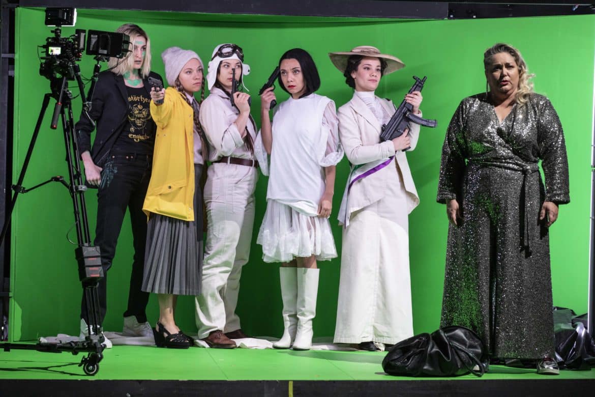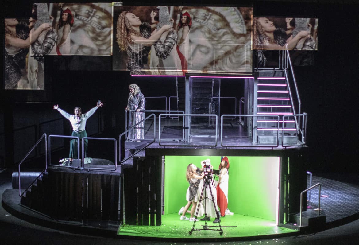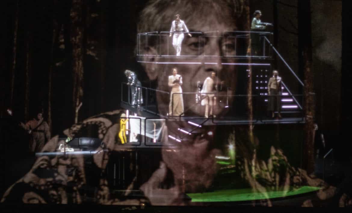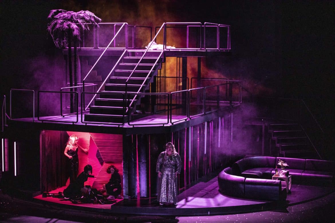 Une fois dûment balancé, le Porc peut et doit être rééduqué. Telle est, semble-t-il, l’une des leçons qu’il faut tirer de la nouvelle production d’Ariane et Barbe-Bleue présentée à l’Opéra de Lorraine. Si Ygraine, Bellangère et les autres refusent finalement de quitter le château, c’est parce qu’elles ont l’intention de faire subir à leur tortionnaire une sorte de révolution culturelle : passé à tabac par les paysans (croisement de Gilets Jaunes et d’attaquants du Capitole de Washington), menacé par le club de golf que lui a confisqué Ariane, affublé d’un bonnet phrygien, Barbe-Bleue ne sera pas envoyé en camp de travail, mais sera obligé de se plonger dans de saines lectures qui lui feront prendre conscience que tout a changé. Dans cette grande villa où se déroule l’action – beau décor signé Nina Wetzel, tournant et parsemé de néons, comme ceux de Pierre-André Weitz –, les cinq premières épouses rêvent déjà de révolte car, lors de l’ouverture des portes, une vidéo réalisée en direct nous les montre adoptant divers déguisements de femmes rebelles. La rébellion se concrétisera au dernier acte, lorsqu’elles prendront le costume de leurs modèles, suffragette, Greta Thunberg ou Uma Thurman dans Kill Bill. Vêtements et décors se couvrent de slogans « révolutionnaires », mais Ariane ne parviendra pas à les convaincre d’aller porter à l’extérieur leur message anti-porcs. Ariane et Barbe-Bleue est une œuvre difficile à monter de manière convaincante, car elle inclut un certain nombre de passages où l’action se relâche ; certains optent pour le mythe, comme Stefano Poda à Toulouse dernièrement, d’autres pour la transposition vers notre réalité, comme le fait cette fois Mikaël Serre à Nancy.