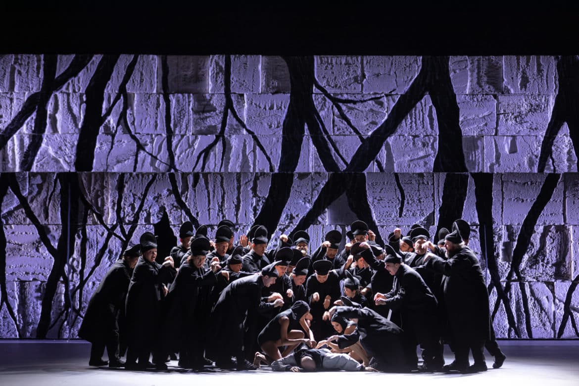 À rebours de lectures qui laissent davantage de place aux fastes, le propos est ici recentré sur l’intimité du drame des amours contrariées, dans une épure classique plus proche des anti-lieux raciniens que des pittoresques baroques. La scénographie décantée de Prune Nourry, en noir et blanc, sous les modulations lumineuses d’Eric Soyer qui prennent à l’occasion des bleutés oniriques galbant l’espace avec une évidente sensibilité, contribue à cette austérité, prégnante surtout dans les deux premiers actes, que ne précédent qu’un réarrangement par Leonardo Garcia Alarcon d’un extrait du Prologue, entre le Temps et Flore, « Les voilà ces humains », et de l’Ouverture – après une réorchestration baroque adaptant l’hymne ukrainien en guise de préambule circonstancié, avec le discours du directeur de Grand-Théâtre, Aviel Cahn. Au III, la pierre blanche jérusalémite se creuse de branches et de racines, dans de très belles nervures développant la métaphore de l’arbre, devenir d’Atys, jusque dans l’ultime scène, où à un arbre de cordes pastichant quelque Homme de Vitruve remontant vers les cintres est suspendu l’objet cultuel du corps défunt. Les variations calotines des costumes dessinés par Jeanne Vicérial participent de la réduction des rituels de Cybèle à leur quintessence dramaturgique.