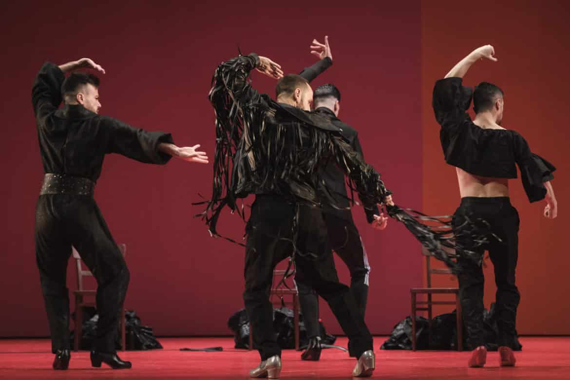 Faire se côtoyer le Journal d’un disparu de Janáček et L’Amour sorcier de de Falla au sein d’un même spectacle, c’était, a priori, choisir comme principe dramaturgique l’effet de contraste : on s’attendait à ce que Daniel Fish souffle le chaud et le froid, en opposant la terre brûlée d’Espagne aux sols gelés des pays slaves, le soleil brûlant d’Andalousie aux froids frimas de la Tchéquie. Il n’en est rien : en permettant aux deux personnages féminins (la tsigane Zefka et la gitane Candelas) de fusionner en une seule et même figure (celle de la femme amoureuse, d’abord courtisée puis délaissée), le metteur en scène met sinon l’Espagne, du moins la culture latine – et les caractéristiques ou clichés qui y sont traditionnellement attachés : amours passionnées, sentiments extrêmes possiblement mortifères, tempéraments sanguins… – au cœur du spectacle, et ce dès le cycle de mélodies de Janáček, où le chant de Janik se déploie devant de grands murs rouges, unique élément de décor avec les chaises sur lesquelles prennent place chanteurs et danseurs. Le chant du personnage est par ailleurs prolongé par la chorégraphie à la fois mystérieuse, poétique et violente conçue par Manuel Liñán, maître ès flamenco (les danseurs, exclusivement des hommes, revêtent parfois le traditionnel traje de flamenco avec traîne, volants, mantille et chaussures à talon, et recourent en grande partie à la grammaire flamenca : respect rigoureux du compás – cette attention au rythme qui lie tous les acteurs du spectacle, qu’ils soient musiciens, danseurs ou chanteurs –, utilisation du corps dans sa dimension gestuelle – mobilisation récurrente des bras, poignets, doigts –, ou percussive – technique de frappe du pied pour accentuer le discours musical). De fait, c’est bien de prolongement qu’il s’agit et non pas d’illustration : les danseurs ne jouent en effet aucun rôle particulier ; ils ne se substituent pas aux personnages du drame, n’incarnent jamais Janik, Zefko, Candilas ou la sorcière. Ni masculines, ni féminines, tantôt êtres humains, tantôt animaux ou monstres indéterminés, les figures qu’ils donnent à voir rendent visibles, allégorisent en quelque sorte les sentiments ou la violence des passions qui agitent les personnages mis en scène dans les deux ouvrages.