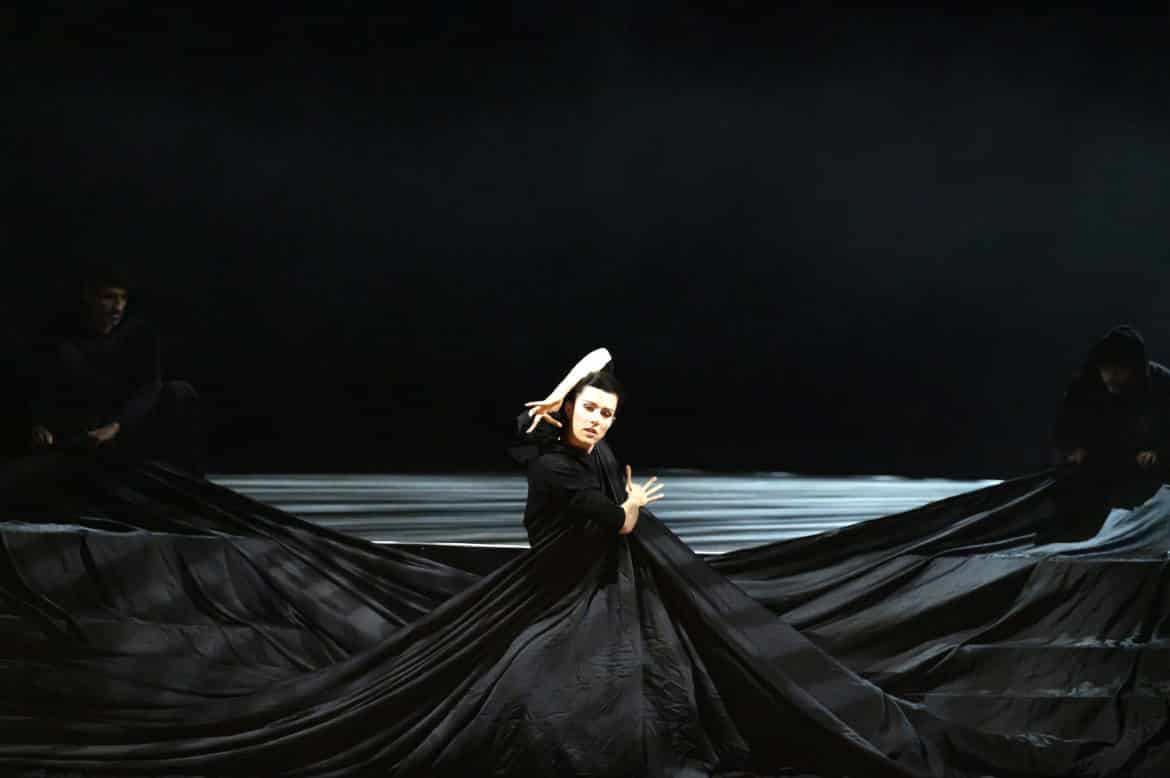 Eric Oberdorff signe ici une mise en scène sombre et poétique, puissamment suggestive et d’une intemporalité morale telle un îlot d’éternité au sein d’un monde et d’une actualité toujours changeants. Extrêmement chorégraphiée et sans cesse en mouvement, l’action prend vie autour, sur et en-dessous d’une tournette déjà aperçue dans une production de l’Opéra de Nice,  Akhnaten, autre sujet solaire s’il en est. Pour animer ce plateau mouvant, le metteur en scène met à contribution deux circassiens et quelques danseurs contemporains de la Compagnie Humaine.  À la fois danseurs et acteurs du drame à l’égal des solistes et du chœur, la qualité de leur réalisation technique ne lasse pas de subjuguer.