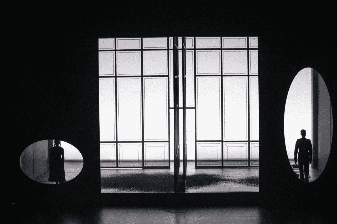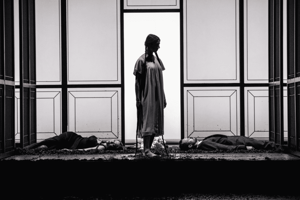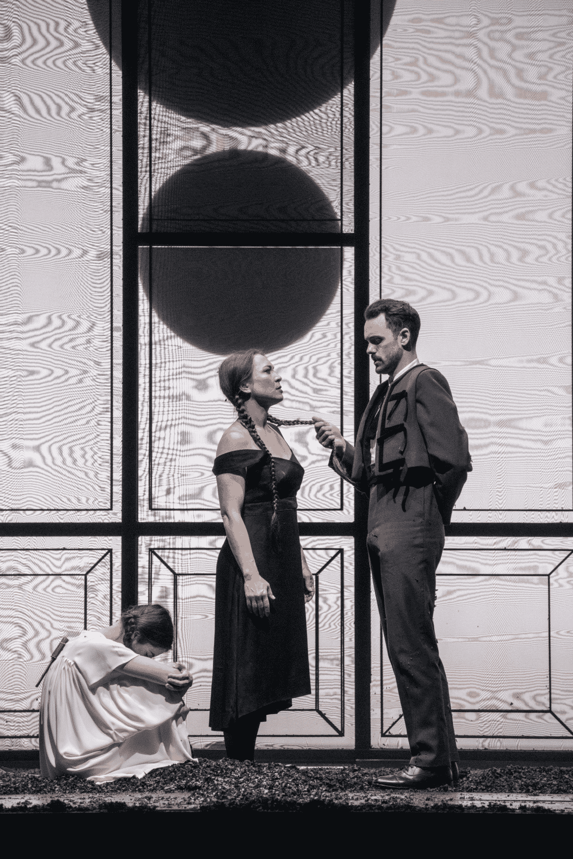 La scénographie réglée par Silvia Costa affirme une décantation au diapason d’une épure dramaturgique aux confins du psychologique. Les tonalités sombres, nocturnes, sinon noires, des décors, et que ne démentiront guère les costumes intemporels de Laura Dondoli, contrastent avec les variations de blanc dans les lumières de Marco Giusti, d’une évidente beauté expressive, calibrée subtilement au gré des évolutions affectives. L’espace domestique où se noue l’intrigue est condensé en son abstract oppressant, modulé par des panneaux mobiles, à la fois murs et fenêtres. Comme à son habitude, la metteur en scène s’appuie sur quelques accessoires – chaise, table, vaisselle suspendue – pour esquisser le minimum de réalisme requis, sans céder à la tentation de l’imitation naturaliste. La noire pluie de confettis accentue la plongée dans la nuit des désirs et des fantasmes, tandis qu’une averse de sable ensevelit tout espoir à la fin, quand le sacrifice de Julie est suggéré par la solitude d’un balai déserté par la jeune femme.
