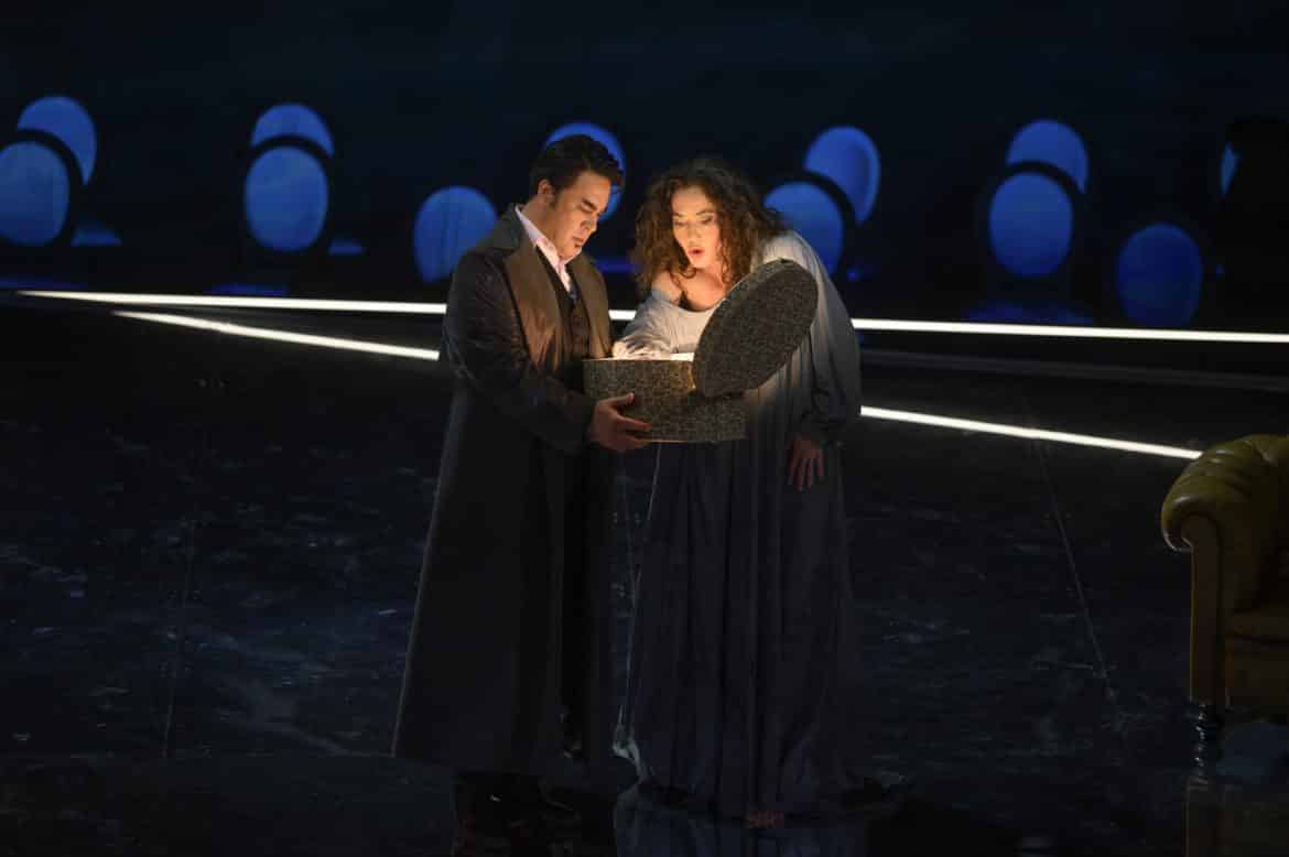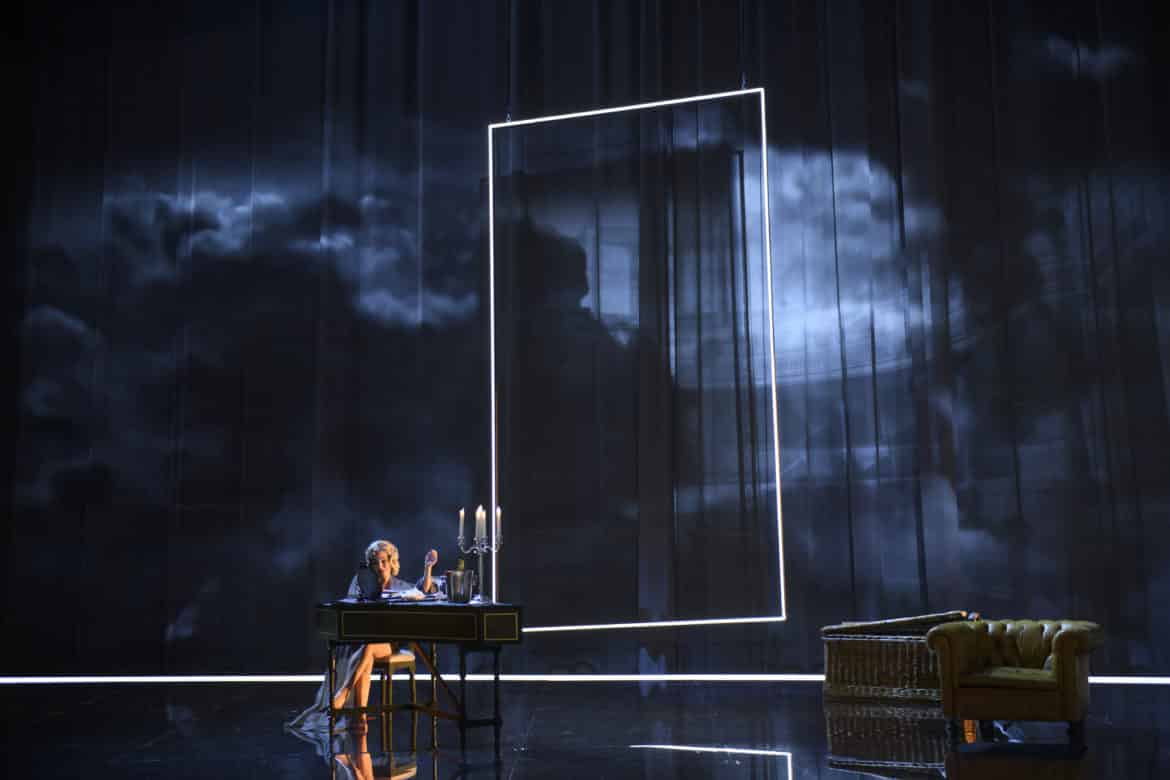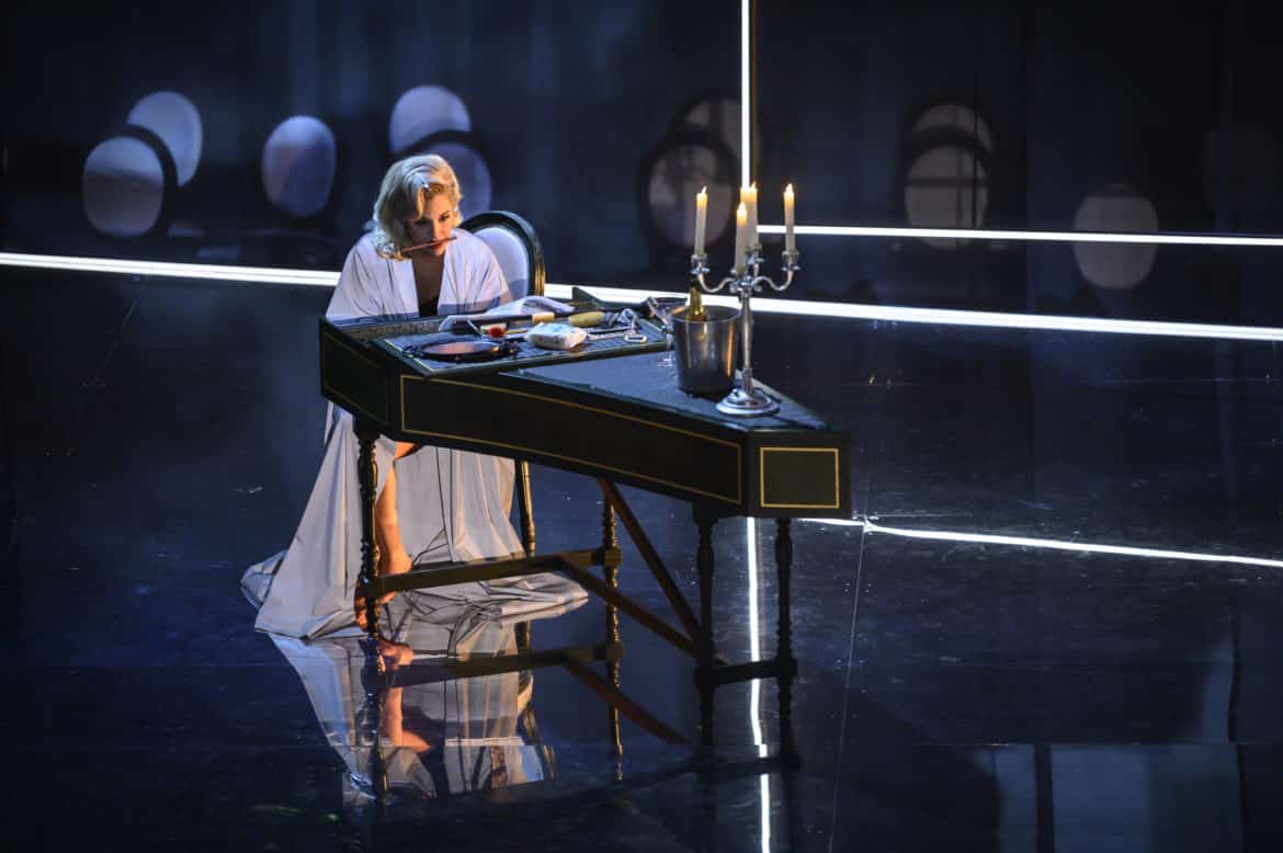 Vincent Boussard replace le théâtre au centre de cette production. L’intrigue l’y aide aisément, la scénographie nous y plonge. Les décors de Vincent Lemaire participent de cette habile mise en abyme avec cet imposant cadre de scène inversé et, en toile de fond, la représentation obscurément stylisée d’une salle de spectacle à l’italienne. Le chœur en fond de scène, comme en miroir, prend la place du public et c’est un théâtre qui apparaît. De la salle, la vraie, la nôtre, nous assistons au spectacle du spectacle, en découvrons les coulisses mais les quittons souvent pour revenir à la vraie comédie humaine. Les rencontres entre les êtres, tout comédiens qu’ils soient, ne se départissent jamais d’une émotion réelle où les passions échappent à la maîtrise. Ce jeu subtil entre le personnage et son interprète d’un théâtre dans le théâtre où la réalité défie la fiction pourrait perdre le spectateur. Cela arrive parfois mais quel plaisir d’être emporté avec tant de fantaisie dans cet univers fictionnel entre deux mondes. Les vidéos et les lumières poétiques et chimériques de Nicolas Hurtevent et Nicolas Gilli participent de ce voyage initiatique spatial mais également temporel grâce aux étonnants costumes de Clara Peluffo Valentini. Perruques mozartiennes, costumes 19e, jeans et T-shirt de nos jours. Au jeu des illusions, l’équipe réunie autour de Vincent Boussard est assurément vainqueur.
