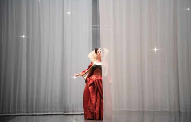 Deux cages roulantes stylisées promenées dans le prologue, avec une reine en majesté, sanglée dans un sublime costume très Tudor ; un rectangle simulant une chambre-cage descendant des cintres à plusieurs reprises ; quelques voilages : voilà les seuls éléments venant ponctuer un espace scénique dépourvu de tout autre décor. Ces voilages permettaient des changements d’atmosphère fluides, subtils, élégants. Cela nous a valu deux belles images théâtrales saisissantes. Au moment de l’annonce du départ d’Enée, le voile tombe et le héros se retrouve dans le noir, face à un miroir. Plus réussie encore, la scène des sorcières, avec ses ombres chinoises tentaculaires et monstrueuses.