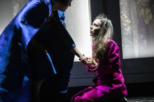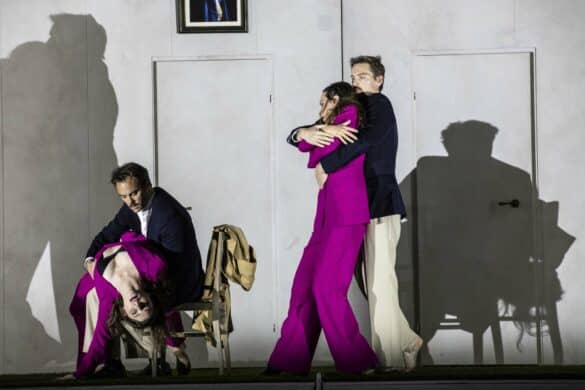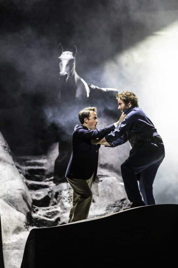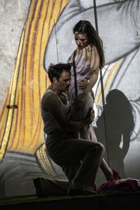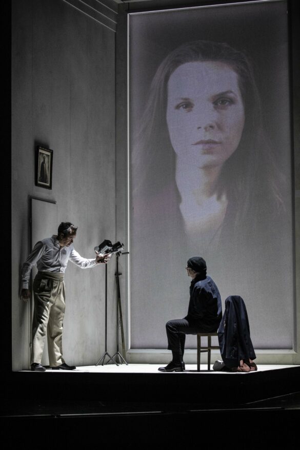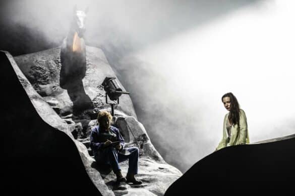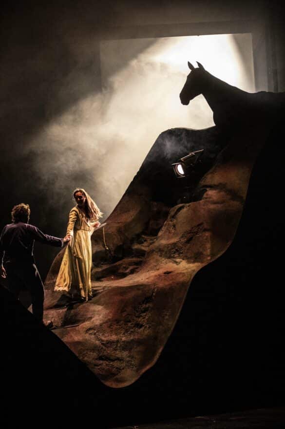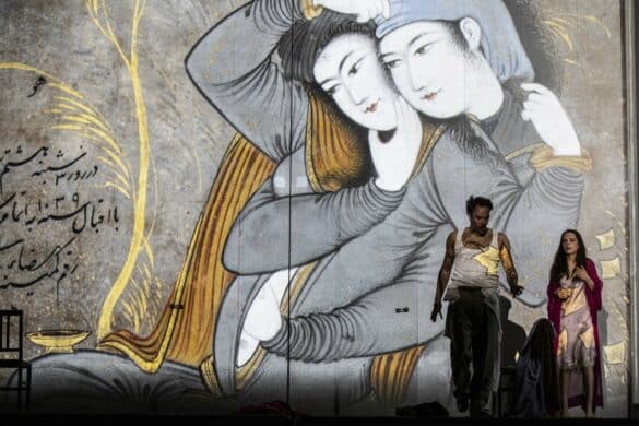 Dans la mise en scène de Richard Brunel, le nouveau directeur de l’Opéra de Lyon, on ne trouve guère d’éléments de contes de fées orientaux : la terre et la garrigue du désert entourent le décor d’Étienne Pluss, dominé par une plateforme tournante qui rend efficacement compte des différents environnements dans lesquels se déroule l’histoire, une action qui procède par regards plutôt que par dialogues : le prince épie la nudité de la femme, elle est envoûtée par son portrait, le garçon épie les deux amants. Ainsi, les murs blancs deviennent des écrans sur lesquels sont projetées de belles images de miniatures persanes, le charmant portrait du prince, les détails de la dernière rencontre et de la mort des amants. Au début est apparue l’image d’une femme aux lèvres cousues. L’entrée nimbée de brouillard (et dans l’éclairage conçu par Henning Streck) du sculpteur Farhâd sur la crête d’une montagne dans laquelle est sculpté un cheval, est particulièrement frappante. Les costumes de Wojciech Dziedzic et la sobre chorégraphie d’Hervé Chaussard sont parfaitement appropriés.