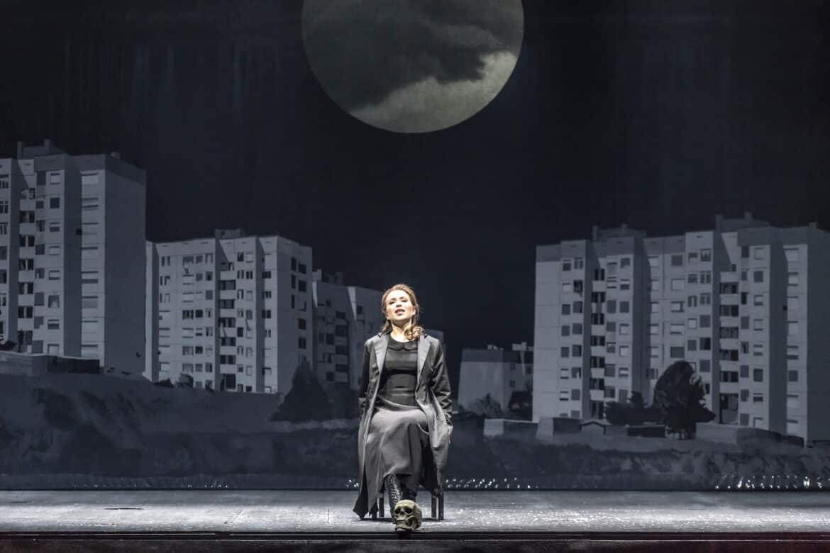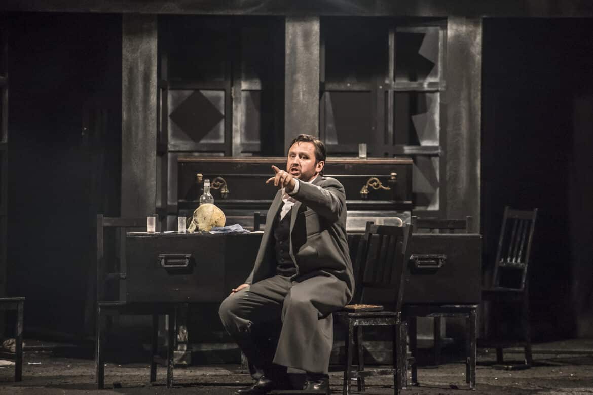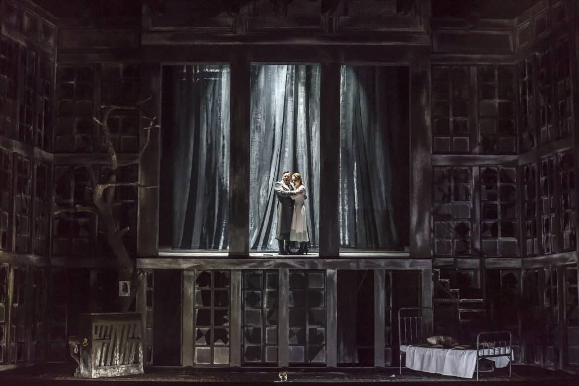 Le décor, toujours aussi impressionnant, représente sur deux niveaux une demeure cossue dont la façade gris-cendre et les carreaux cassés évoquent la splendeur d’autrefois. S’ouvrant sur des intérieurs dépouillés voire misérables (la réception chez le haut dignitaire à l’acte II) dans un opéra qui parle de fin-de-siècle, cette demeure ne trouve, à l’occasion, pour mobilier qu’un lit militaire, rappelant qu’Hermann est officier, un cercueil dans la scène de la mort de la comtesse ou encore un piano droit – de type instrument de répétition – soulignant au passage que Tchaïkovski, au moment de la composition de son opéra, triomphe alors aussi dans l’univers du ballet. Dans certaines scènes-clés, le décor est intelligemment complété par un poétique cyclorama où courent les nuages d’un ciel chargé des angoisses de chacun, un crâne rappelant le goût du musicien (et du metteur en scène !) pour Shakespeare, une lune blafarde – elle aussi très symboliste – s’élevant au-dessus de projections de bâtiments de type stalinien – lors de la pathétique dernière rencontre entre Lisa et Hermann – ou une immense roue scintillante symbolisant à la fois la maison de jeu de la scène finale et le mouvement perpétuel de l’existence, alors qu’une lampe blafarde se balance au-dessus du groupe des joueurs auquel, comme il se doit, est venu se mêler le spectre désabusé et sardonique de la comtesse. Saisissant.