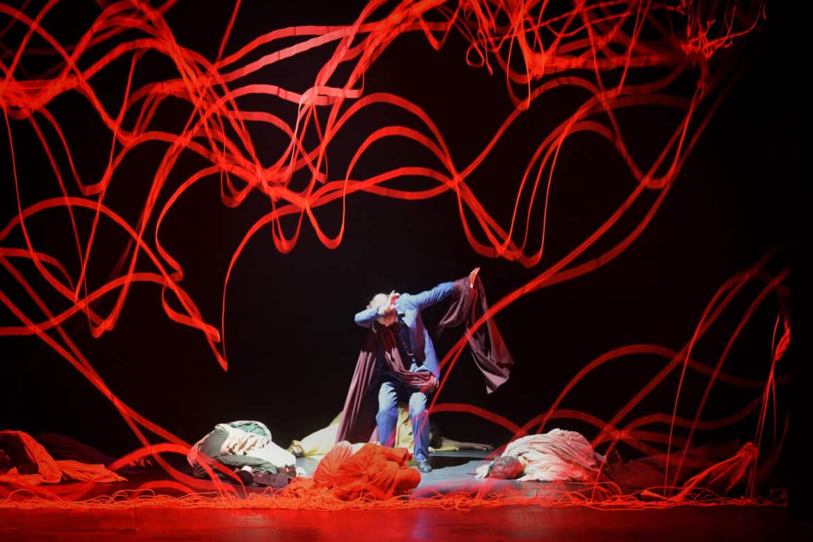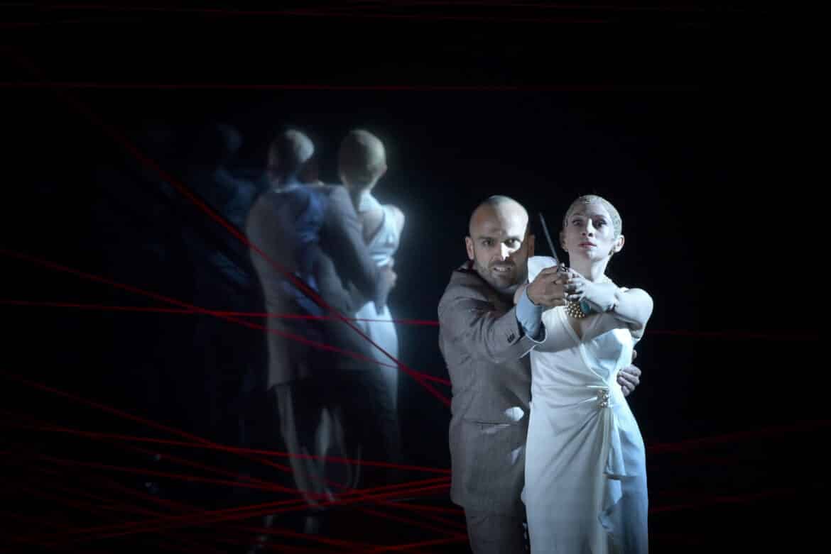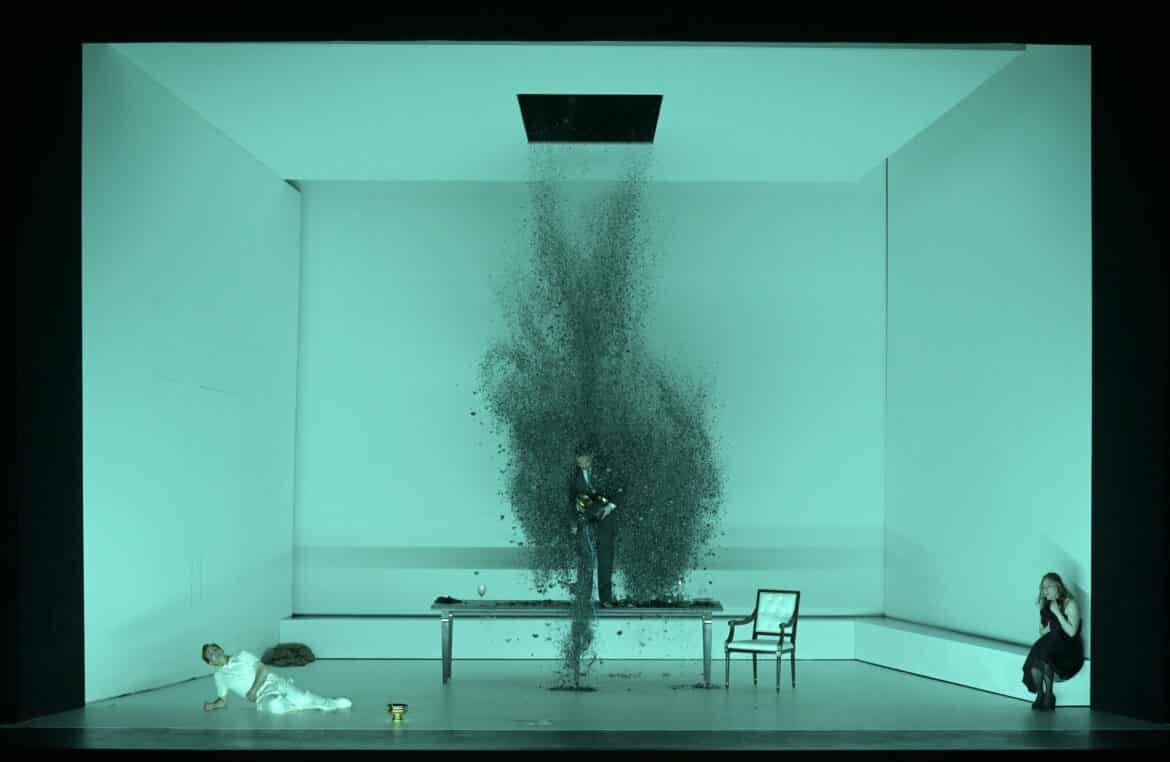À ce non respect de la forme de la pièce théâtrale s’ajoute, pour réduire encore l’efficacité scénique de cette représentation du Giulio Cesare, la mise en scène de Damiano Michieletto, organisée d’après deux idées totalisantes. L’une, que l’on peut partager, consiste à voir toute l’action comme émanant du désir de Cornelia et Sesto de venger l’assassinat (commandé par Tolomeo) de Pompeo, respectivement leur mari et père. Si on suit ce sens, on s’explique alors l’image de celui-ci qui revient constamment, surtout dans l’acte II – d’abord habillé, puis nu, comme dans un enfer dantesque –, et qui enfin se fige, avec les symboles de son pouvoir, comme la statue aux pieds de laquelle Cesare sera un jour assassiné dans le sénat de Rome (les grandes tâches de sang qui restent sur la scène pendant tout l’acte I, telles un memento permanent de l’assassinat de Pompeo, sont elles aussi très suggestives). L’autre lecture, moins convaincante, introduit et renforce, à partir du nouvel entracte, le présage continu de la mort violente de Cesare, évoquée de plus en plus explicitement par les trois Parques, qui parcourent sans cesse la scène avec leur fil ou sont représentées en mille diffractions à l’infini ; par les casques (incompréhensibles !), en forme de crâne de cheval, chevreuil ou bélier, portés par ces mêmes Parques mais aussi par Cleopatra, pendant une de ses arias ; et par les ombres prémonitoires des sénateurs romains frappant Cesare de leurs dagues et poignards.