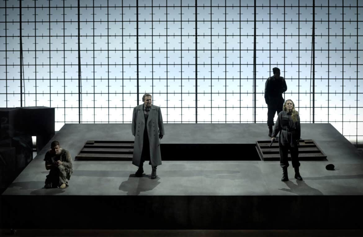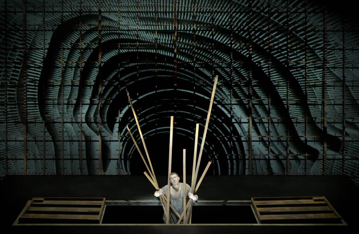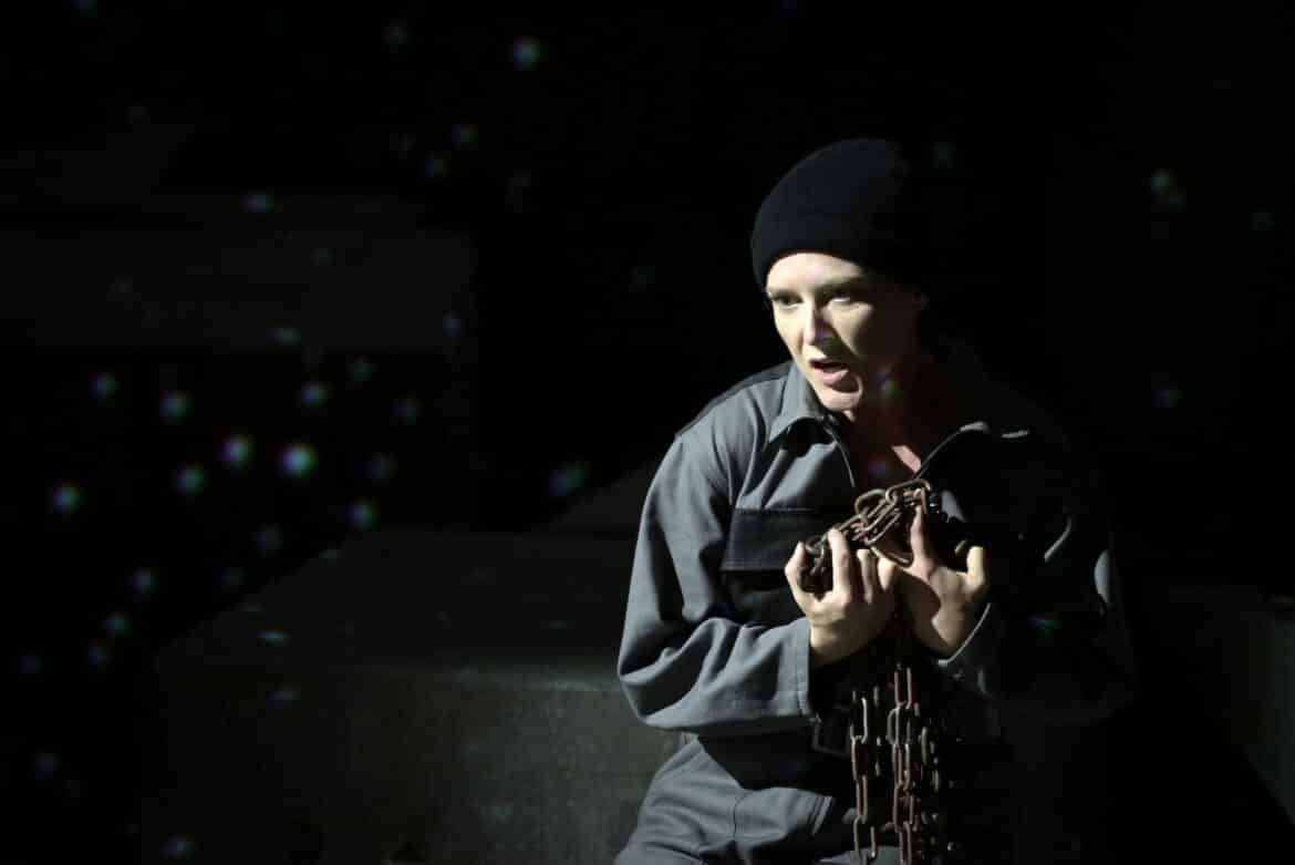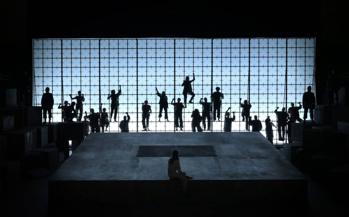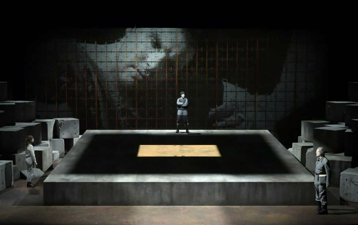 Après une Nonne sanglante de belle mémoire (Opéra-Comique, 2018), Laurence Equilbey retrouve David Bobée, cette fois-ci pour un Fidelio à la Seine musicale. Les conditions sont bien sûr très différentes, l’auditorium Devedjian n’étant évidemment pas une salle spécifiquement conçue pour les représentations scéniques. Le fait est que David Bobée parvient à composer habilement avec les contraintes posées par le lieu. La scénographie (des blocs de béton, un pan incliné comportant une trappe cadenassée d’où sortira Florestan) traduit parfaitement l’aspect oppressant de l’intrigue. On pouvait craindre que ce décor pour le moins austère ne finisse par lasser au fil des deux actes… Ce n’est pas le cas, grâce à l’utilisation du mur de fond de scène, permettant certaines projections et jeux de lumières, mais aussi à un habile jeu d’acteurs, qui gagne en intensité au fur et à mesure que le drame se noue. Seuls éléments (nous a-t-il semblé) dispensables : les projections de motifs ondoyants qui viennent régulièrement rythmer le déroulement du drame. Et deux moments particulièrement forts : la libération provisoire des prisonniers qui apparaissent devant un mur lumineux qu’ils escaladent lentement, comme dans une vaine tentative de recouvrer la liberté. Et surtout l’apparition de Florestan surgissant, brisé, de son cachot… nouveau Saint-Sébastien dont le corps n’est pas percé de flèches mais entravé par des poutres disposées à cet effet par les geôliers.